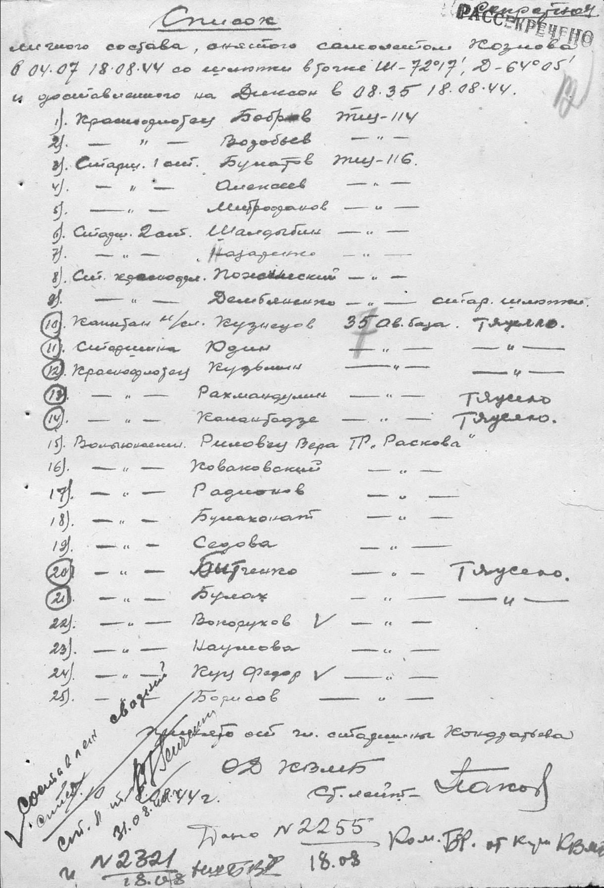 Юдин (Юлин) Иван Семенович (Степанович), спасен; воинское звание – старшина; должность (специальность), часть – командир отделения 37 авиабазы ВВС БФ; дата рождения – 25.12.1922 г.; место рождения – Ульяновская обл., с. Кузоватово; партийность – б/п; социальное положение и происхождение – рабочий из рабочих; национальность – русский; служба в армии – в РККА с 09.1940 г.; награды – медаль «За боевые заслуги», орден Отечественной войны I степени (1985 г.); дополнительная информация – получил обморожение II и III степени. При гибели транспорта «Марина Раскова» в составе команды по спасению личного состава спас из состава команды 22 человека. Будучи оставленным в открытом море на шлюпке без пищи и теплой одежда, при 7-бальном шторме, продержался 7 суток. Откачивал круглосуточно воду из шлюпки, шел на лишения, имел обморожение ног.