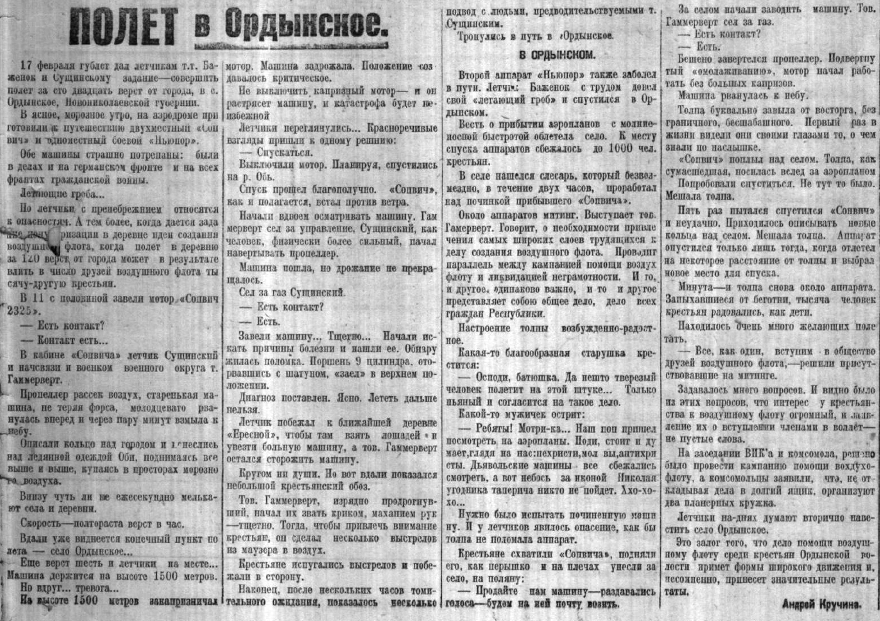 17 февраля гублет дал летчикам т.т. Баженок и Сущинскому задание—совершить полет на сто двадцать верст от города, в с. Ордынское, Новониколаевской губернии. В ясное, морозное утро, на аэродроме при готовили к путешествию двухместный «Сопвич» и одноместный боевой «Ньюпор». Обе машины страшно потрепаны: были в делах и на германским фронте и на всех фронтах гражданской войны. Летающие гроба...