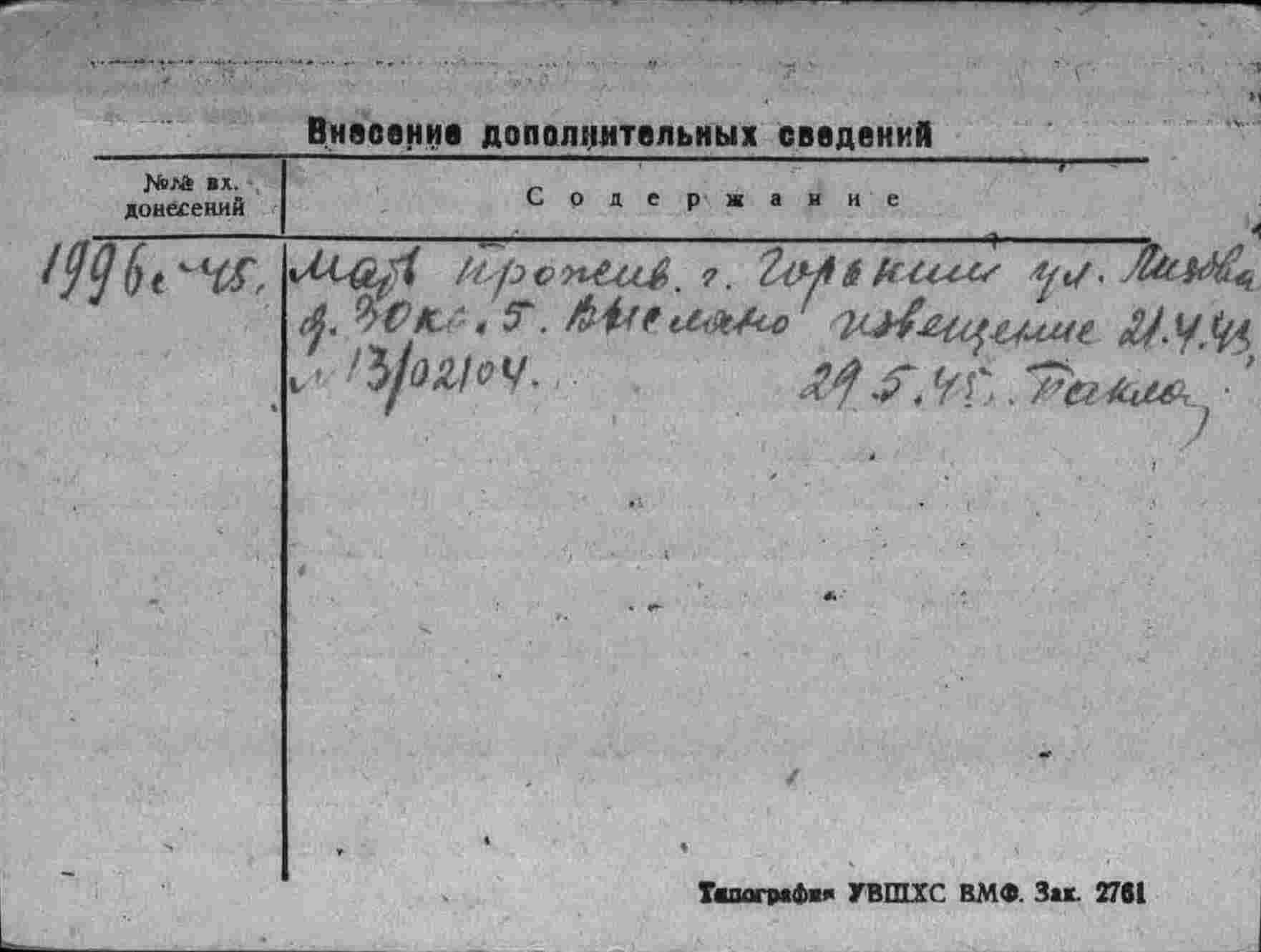 И.И. Аленин пропал без вести в связи с исполнением служебных обязанностей в районе военно-морских действий.