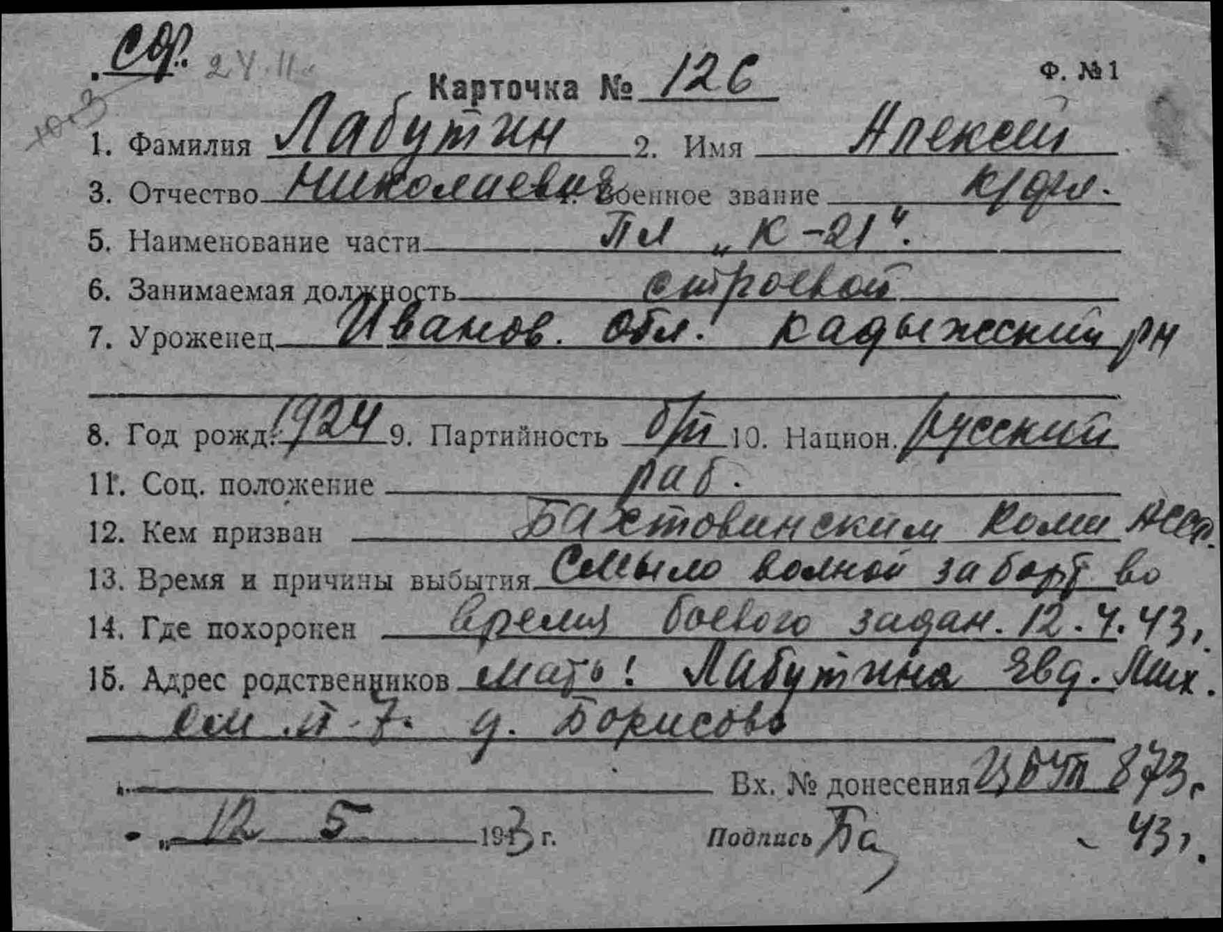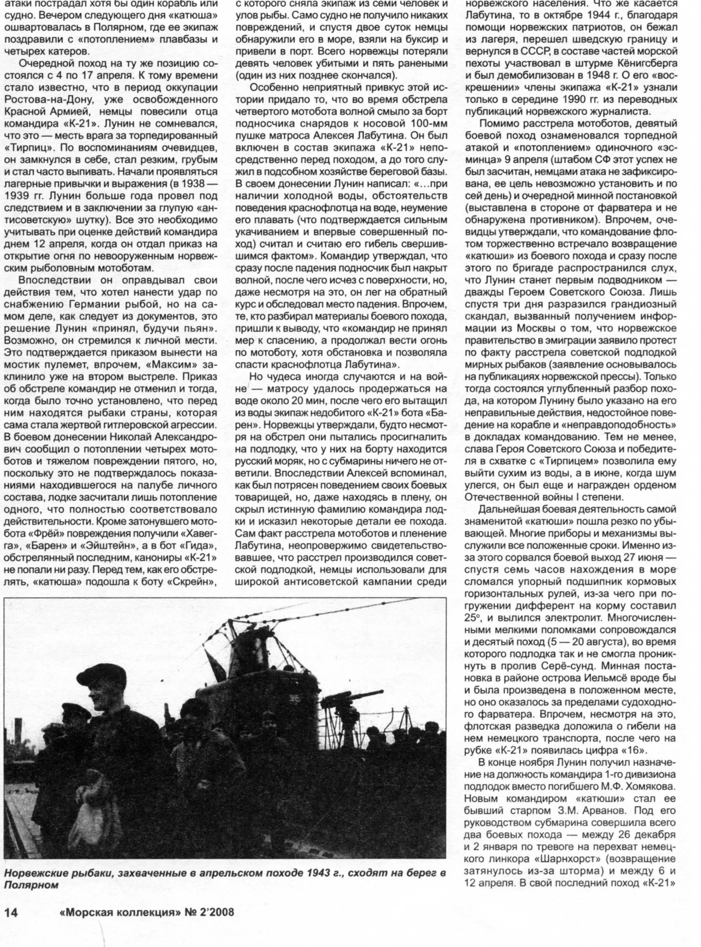 Однако и К-21 понесла потери: исчез матрос Алексей Лабутин. Норвежцы здесь были не при чем: рыбаки не имели оружия. 19-летний Алексей выполнял на лодке обязанности вестового и матроса на камбузе. Однако по боевому расписанию он действовал в качестве подносчика снарядов для носового орудия, и во время обстрела его смыло волной со скользкой палубы. Командир, хотя и заметил потерю бойца, по каким-то причинам отдал приказ на срочное погружение.