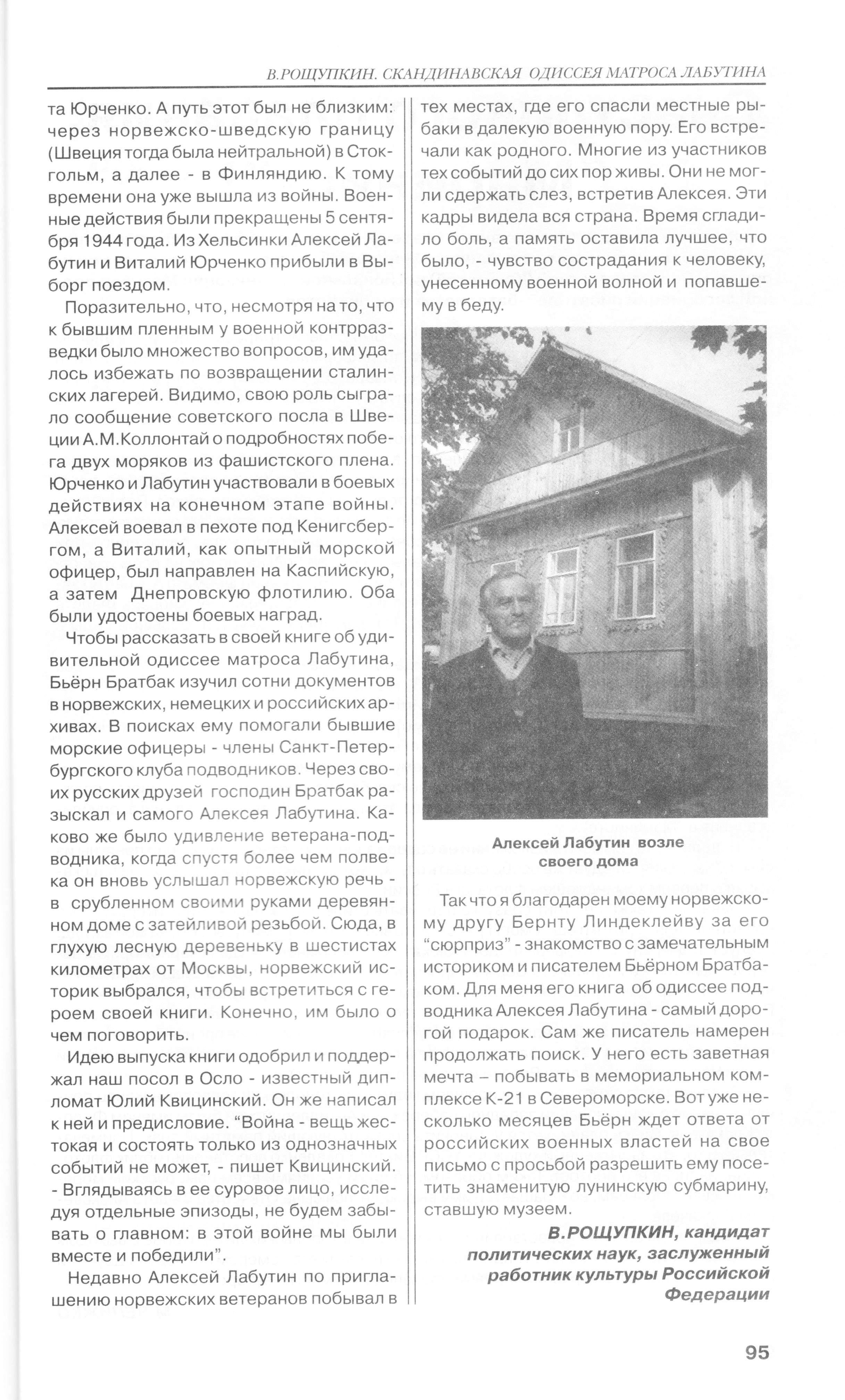 Чтобы рассказать в своей книге об удивительной одиссее матроса Лабутина, Бьёрн Братбак изучил сотни документов в норвежских, немецких и российских архивах. В поисках ему помогали бывшие морские офицеры - члены Санкт-Петербургского клуба подводников. Через своих русских друзей господин Братбак разыскал и самого Алексея Лабутина. Каково же было удивление ветерана-подводника, когда спустя более чем полвека он вновь услышал норвежскую речь в срубленном своими руками деревянном доме с затейливой резьбой. Сюда, в глухую лесную деревеньку в шестистах километрах от Москвы, норвежский историк выбрался, чтобы встретиться с героем своей книги. Конечно, им было о чем поговорить.