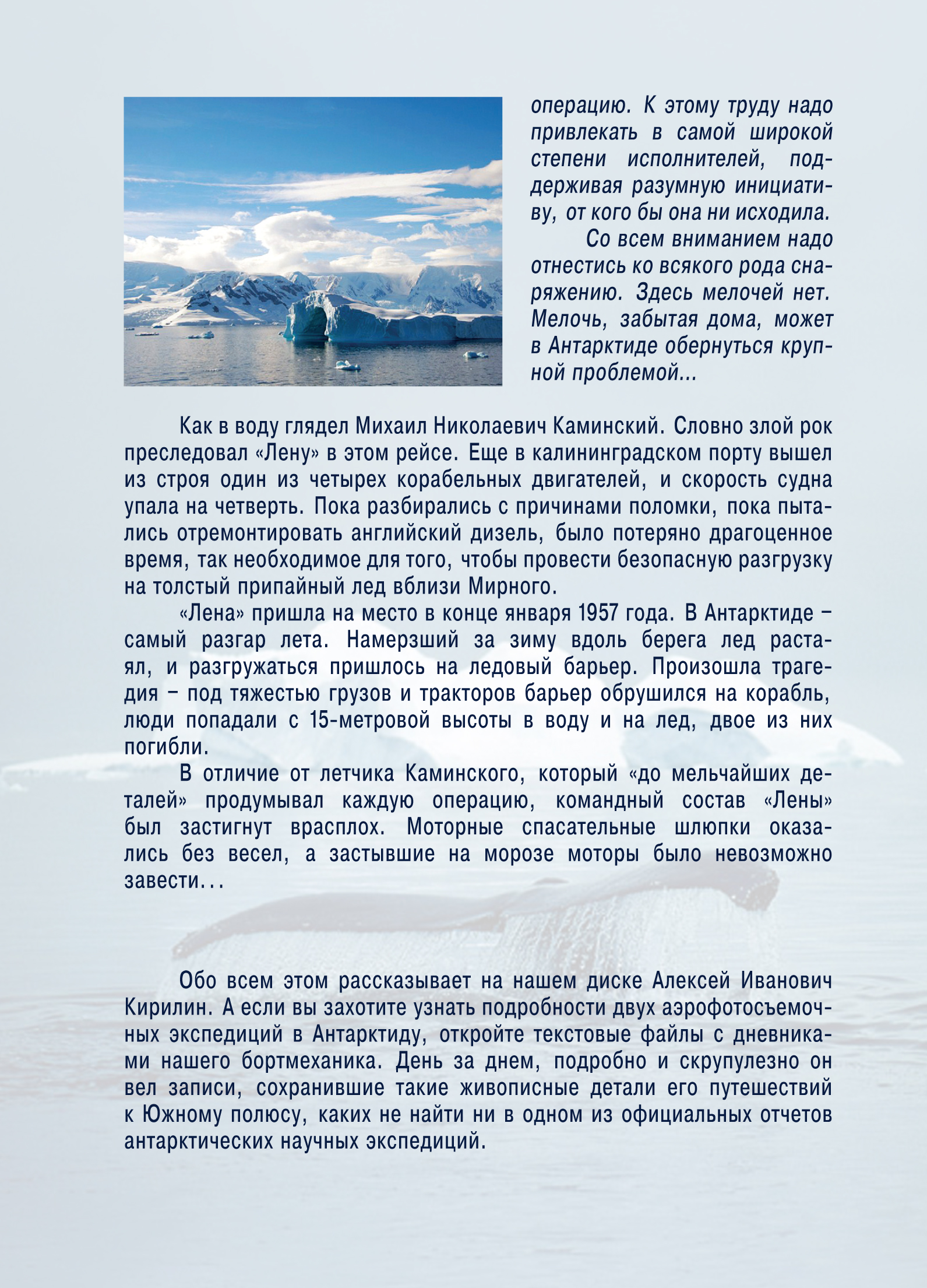 Во избежание этого аккуратнейший радист «СП-5» Любарец все-гда накопленный мусор и выгребленную из печи золу выносит к трещине и высыпает. И однажды он высыпал из ведра, а снег под ногами обвалился в трещину, а с ним – Максим Михайлович!