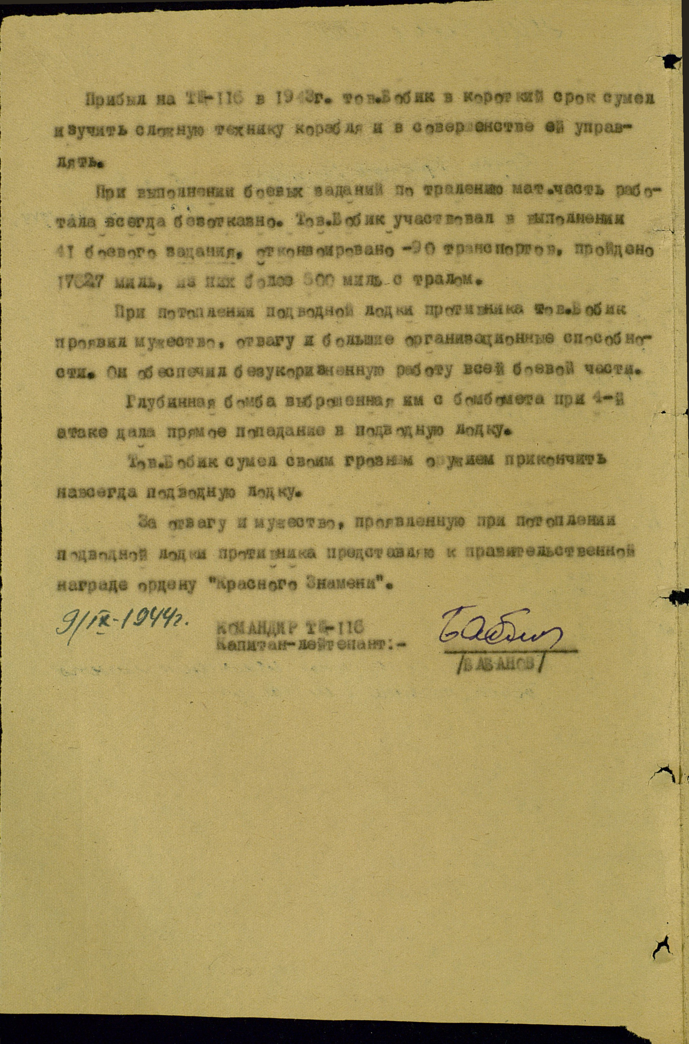 Прибыл на ТЩ-116 в 1943 г., тов. Бобик в короткий срок сумел изучить сложную технику корабля и в совершенстве ей управлять.