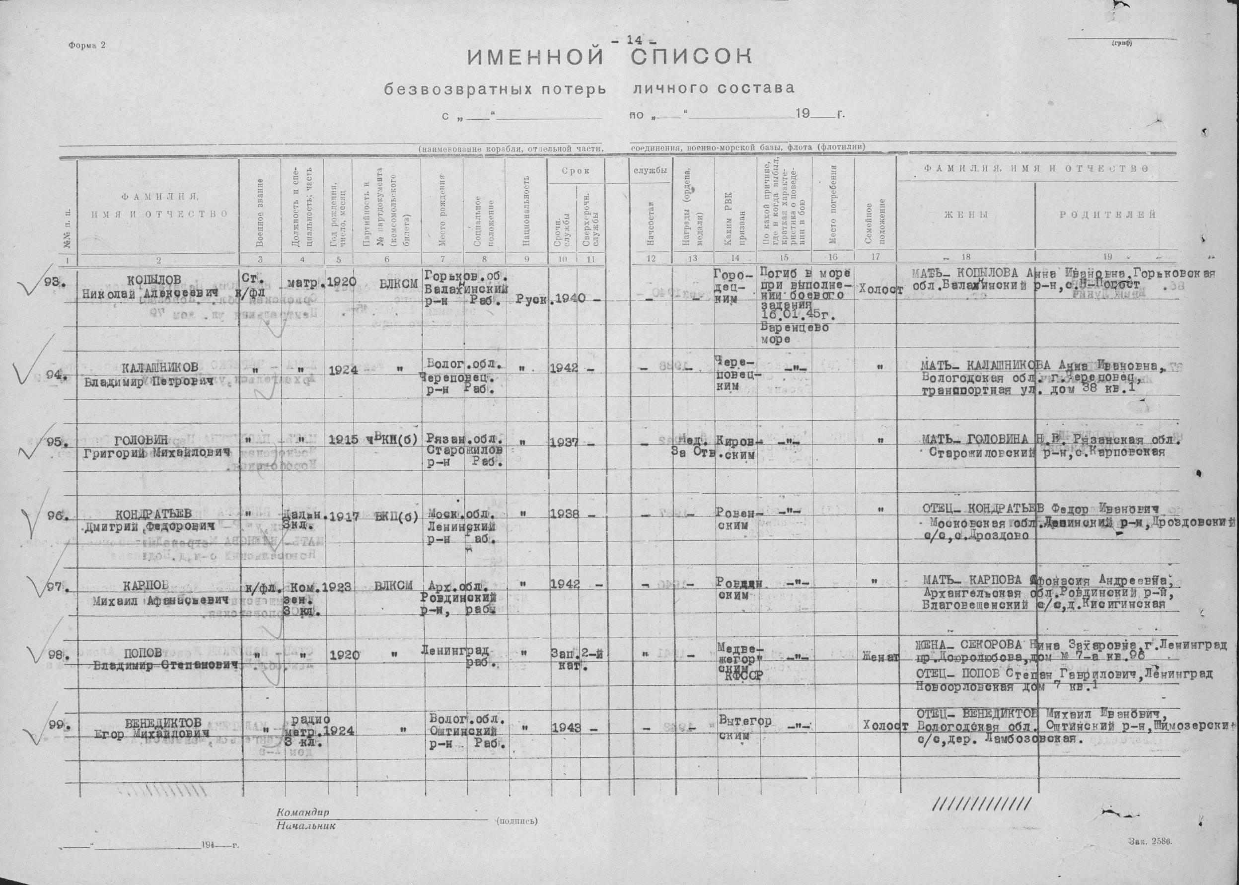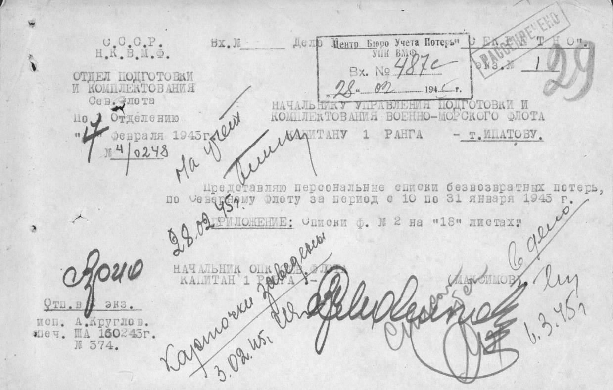 Список экипажа ЭМ "Деятельный" погибших 16 января 1945 года в районе о. Большой Олений при торпедировании германской ПЛ U956.