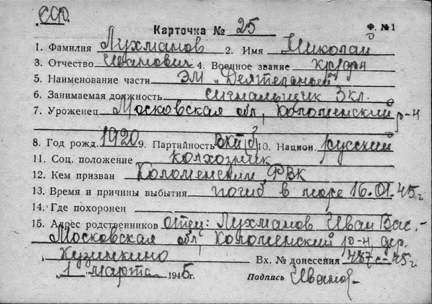 Место призыва Л.-Сталинский РВК