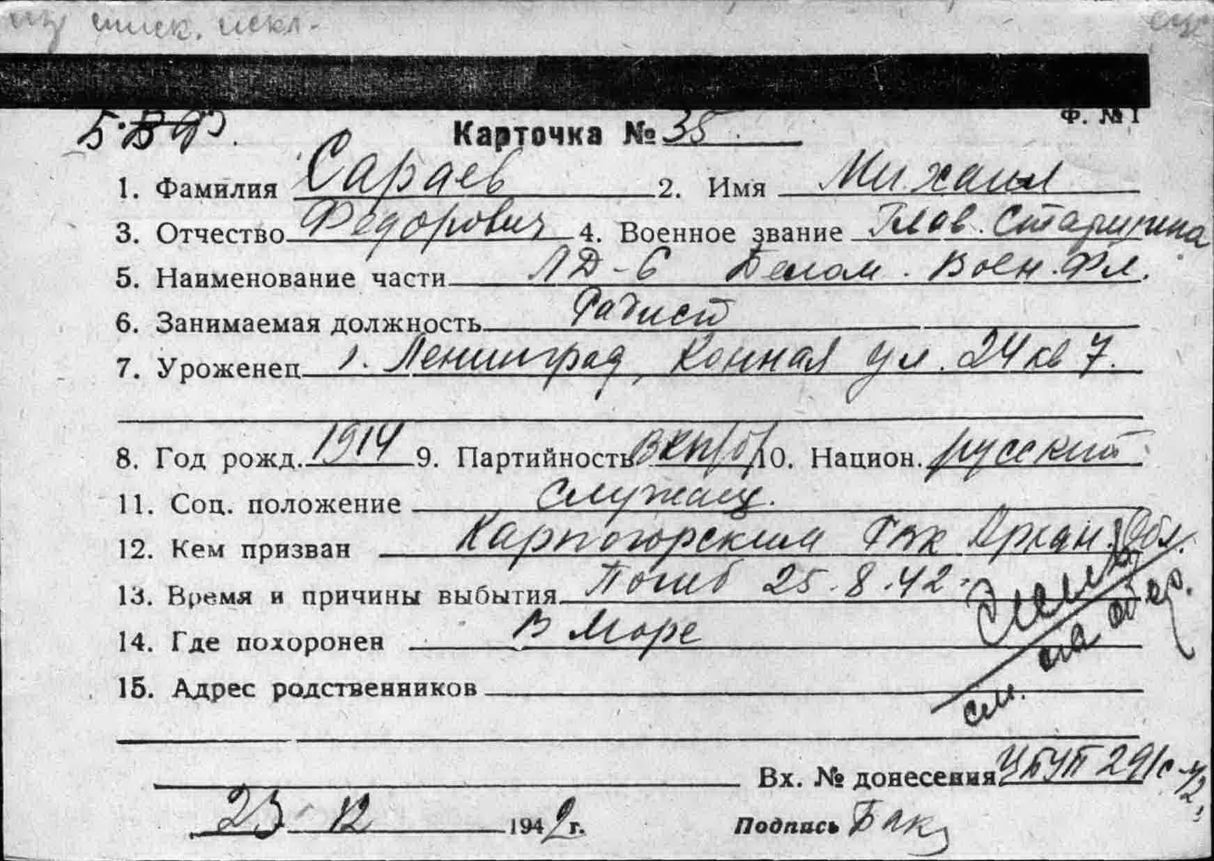 Сараев Михаил Федорович, родился 22 октября 1914 г. в Петрограде. В 1935 г. призван в Военно-морской флот в соединение подводных лодок Северного флота. Участник финской войны. Сначала Великой Отечественной войны плавал на ледокольном пароходе «Александр Сибиряков» старшиной радистов. Зимой 1941 г. в составе экипажа ледокольного парохода «А. Сибиряков» занимался переброской десантных групп на Мурманском участке фронта.