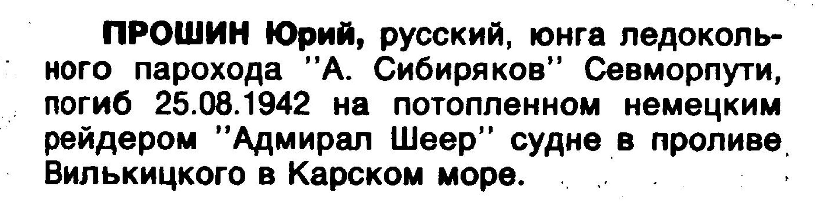 …В последней судовой роли ледокольного парохода «А. Сибиряков» под номером двадцать семь значится Прошин Юрий Константинович, машинист-ученик, 1924 года рождения. Самый молодой в команде… Каким по счёту он погиб, сегодня уже не установить.