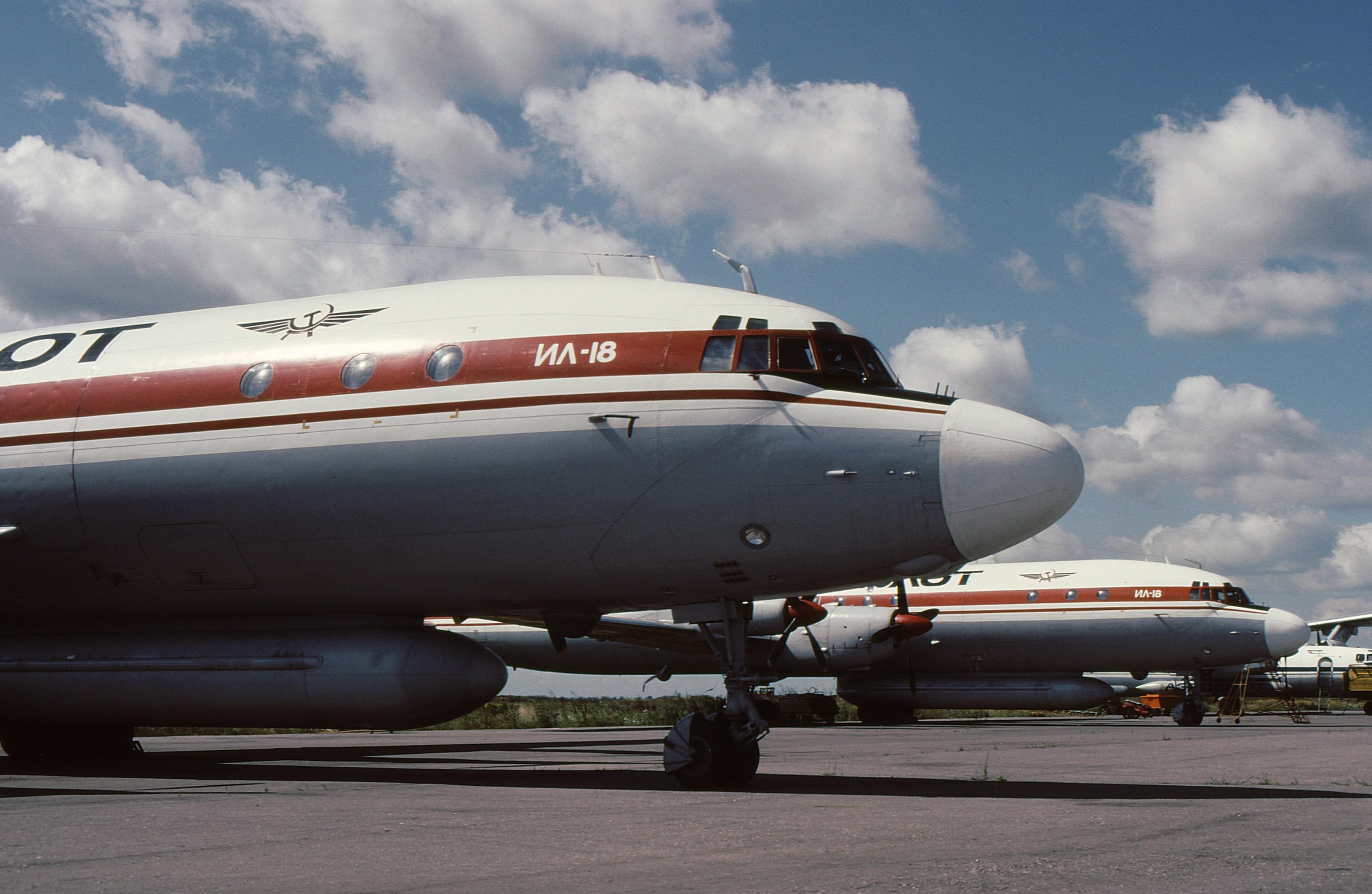Ил-18 СССР-75466 и СССР-75449, стоянка ГосНИИ ГА, 1991г.jpg