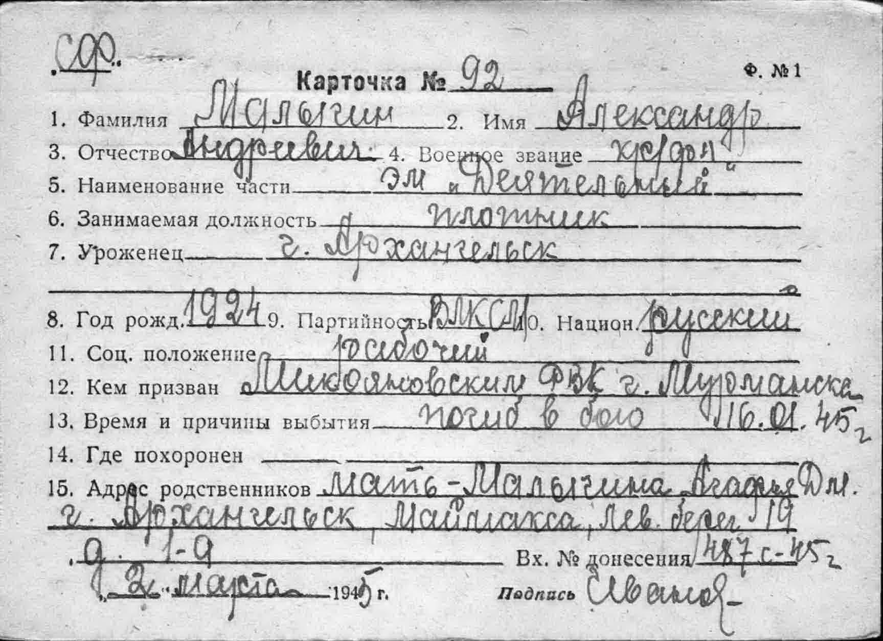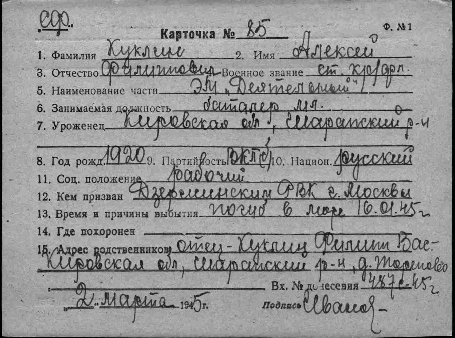 Дата выбытия 16.01.1945