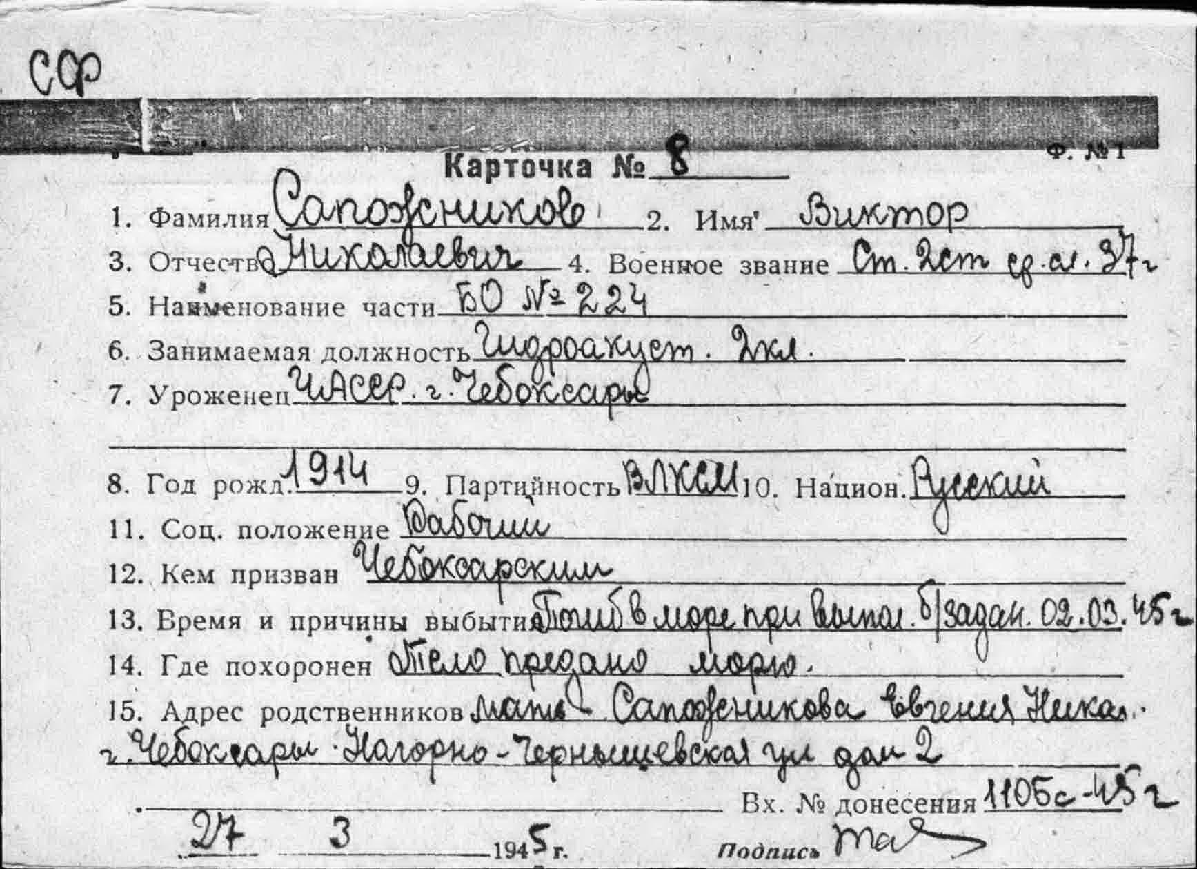 Дата выбытия 02.03.1945