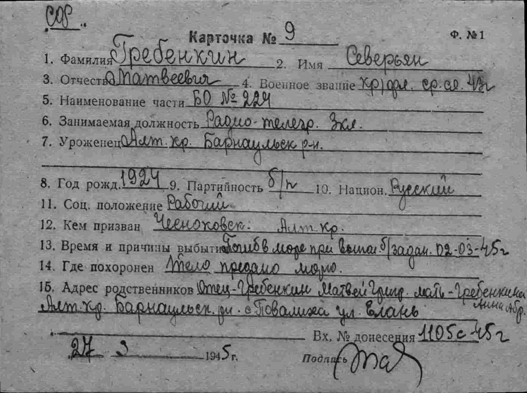 Миронов Василий Куликович,старшина 2 ст,радиотелеграфист 3 к