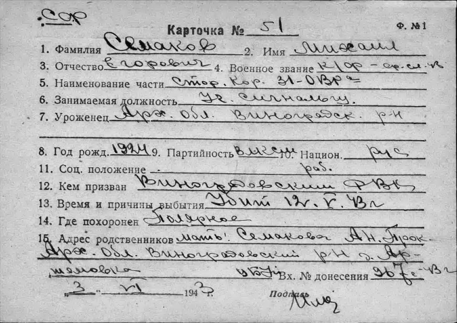 Последнее место службы СФ, 31 стор. кор. ОВР