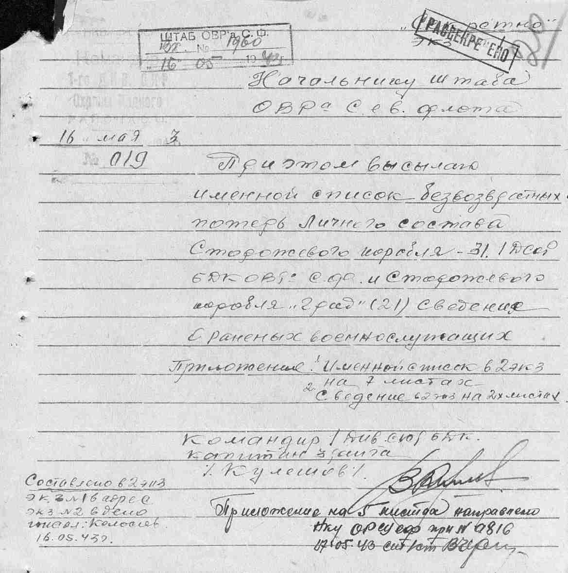 Люфтваффе тем временем продолжало наносить удары по кораблям. 12 мая сторожевик старшего лейтенанта Ненайденко занимал позицию на линии дозора мыс Цыпнаволок – остров Кильдин. Это был бывший 1150-тонный рыболовный траулер Севгосрыбтреста, носивший до 20 июля 1941 г. наименование РТ-43 «Рыбец». Затем его мобилизовали, вооружили двумя 45-мм орудиями и двумя 7,62-мм пулеметами и включили в состав Северного флота.