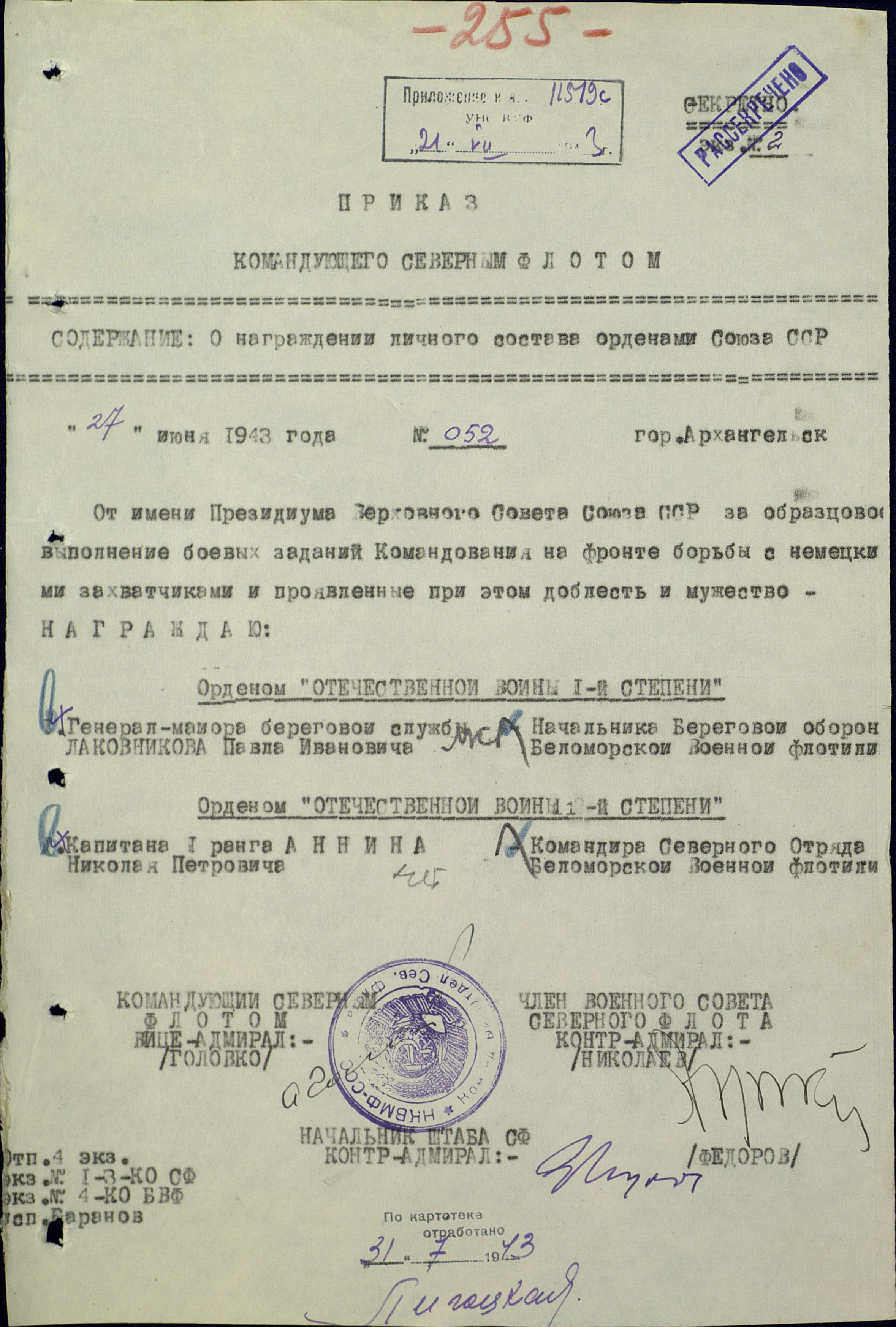 http://ke.culture51.ru/Lakovnikov-Pavel ... p4437.htmlЛаковников Павел Иванович [15(27).12.1892, с. Брусяны ныне Самарской обл. – 12.04.1973, г. Москва], сов. военачальник, генерал-майор артиллерии (1941). Окончил Кронштадтскую школу комендоров (1914), Высшую артиллерийскую школу (1925, г. Пушкин), класс береговой артиллерии спец. курсов ВМС РККА (1930). С 1914 – комендор крейсера «Диана» Балт. флота. В янв. 1918 – окт. 1924 – старшина крейсера «Диана», политком конной разведки 221-го стрелк. п., старшина артиллерии канонерской лодки «Буйный» Волжской воен. флотилии, ком. арт. бат. в Красноводске, в Новороссийской арт. группе, ком. дивизиона в Сев.-Кавказском р-не. С 1925 – ком. 1-й группы береговой артиллерии Крымского р-на береговой обороны (БО), с 1926 – ком. 2-го, 42-го артдивизионов, с 1930 – ком. и военком Батумского р-на БО, с 1932 – пом. флагманского артиллериста, с 1934 – пом. нач. Отдела боевой подготовки и пом. флагарта штаба, с 1935 – пом. коменданта Сев.-Зап. укрепрайона по артиллерии Мор. сил Черного м. С июня 1935 – комендант Мурманского укрепленного района СФ. В июне 1938 репрессирован как «участник военного заговора на СФ», в янв. 1940 восстановлен в кадрах ВМФ. С 1940 – комендант Зап., комендант Кронштадтского сектора БО Гл. базы БФ. С июля 1941 – комендант Ижорского укрепрайона. С нояб. 1941 – пом. команд. Беломор. воен. флотилией по БО и сухопутным войскам, с янв. 1943 – нач. Упр. БО БВФ СФ. С окт. 1944 – комендант Хасанского сектора БО ТОФ, с 1945 – нач. БО Юж. мор. оборонительного р-на (МОР), комендант БО Сахалинской воен. флотилии, с 1946 – комендант БО Владивостокского МОР, с 1947 – Островного МОР ТОФ. С 1947 – нач. 2-го мор. арсенала ВМС, с 1951 – инспектор, ст. инспектор Гл. инспекции ВМС. Участник 1-й мировой (1914–1918), Гражд. войн, воевал против войск А. В. Колчака и П. Н. Врангеля, участвовал в Вел. Отеч. (1941–1945) и сов.-япон. (1945) войнах. Руководитель создания и обеспечения береговой обороны Кольского п-ова в годы Вел. Отеч. войны. Руководитель и участник конвойных операций СФ. Награжден орденами Ленина (1945), Красного Знамени (1944, 1948), Отечественной войны I ст. (1943), Красной Звезды (1935), медалью «За оборону Советского Заполярья» и др., именным оружием.