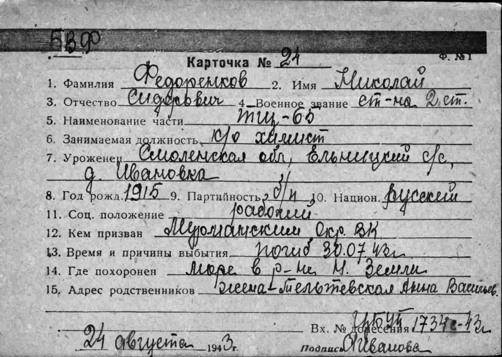 в РККА с 1941 года Место службы: СКР 81 3 ДСКР ОВР ИВМБ БФ