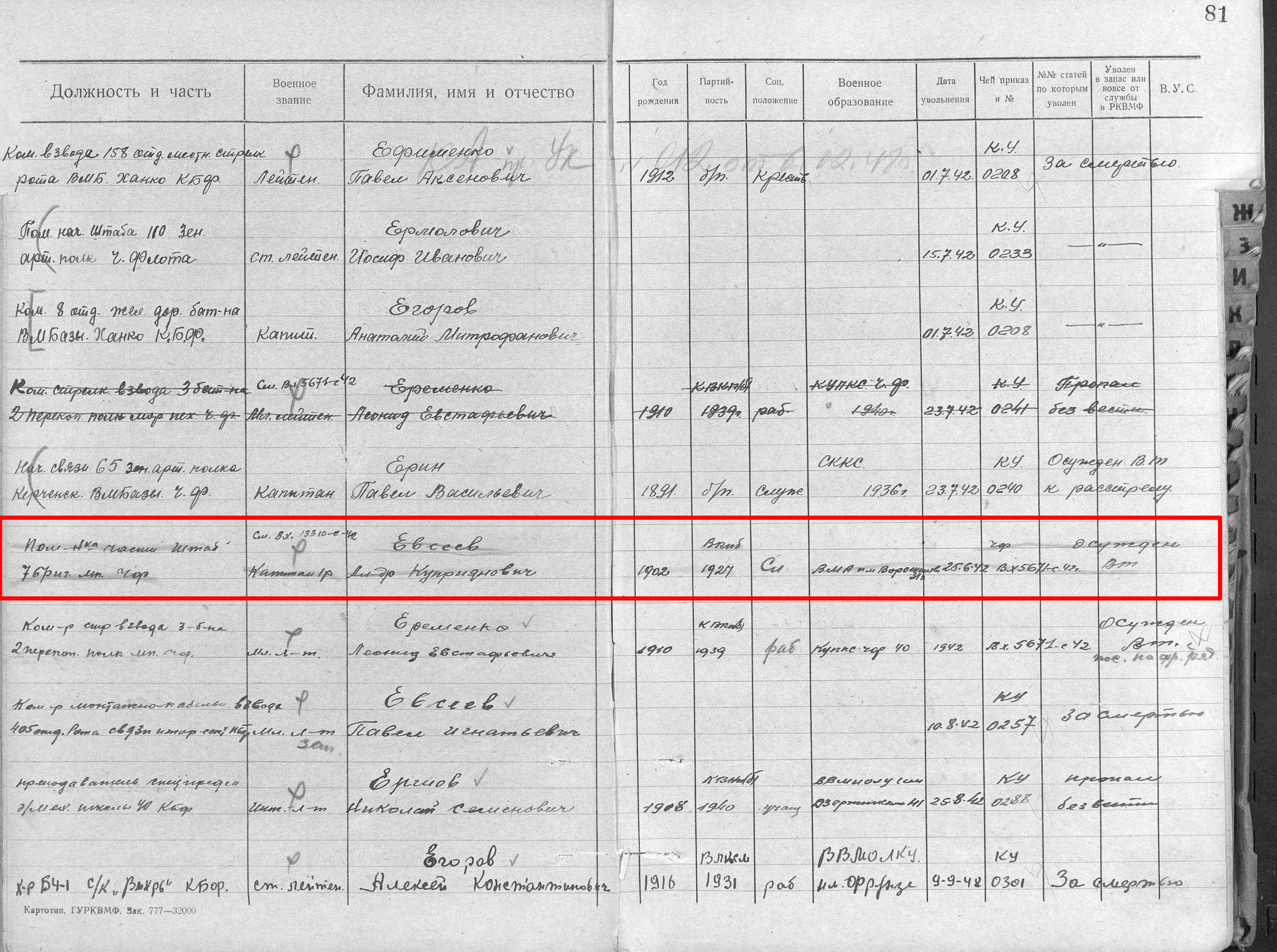 ОРСО Беломорской ВФ №01655 от 03.09.1943 г., ЦБУП УПК ВМФ вх.№2262с 09.10.1943