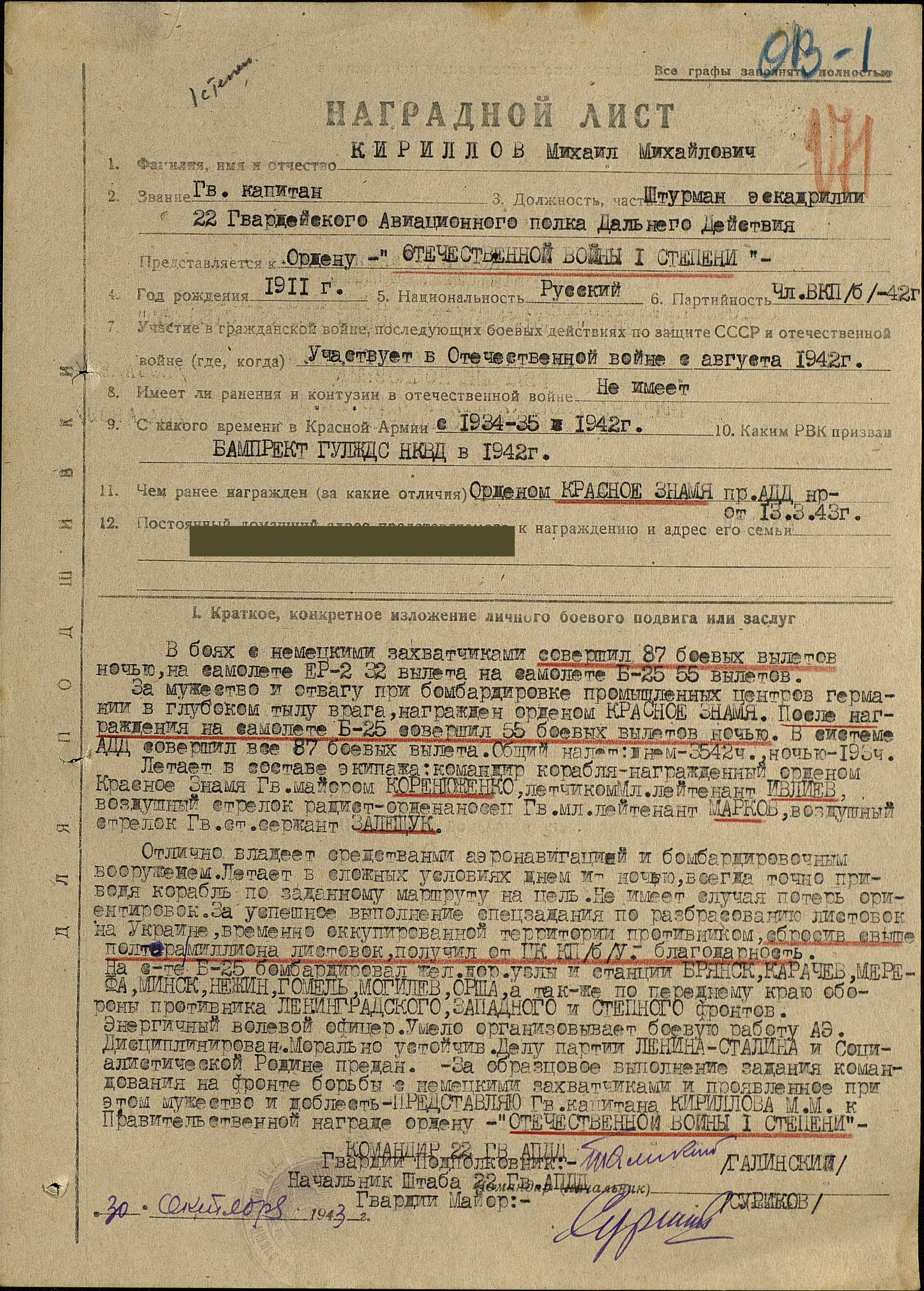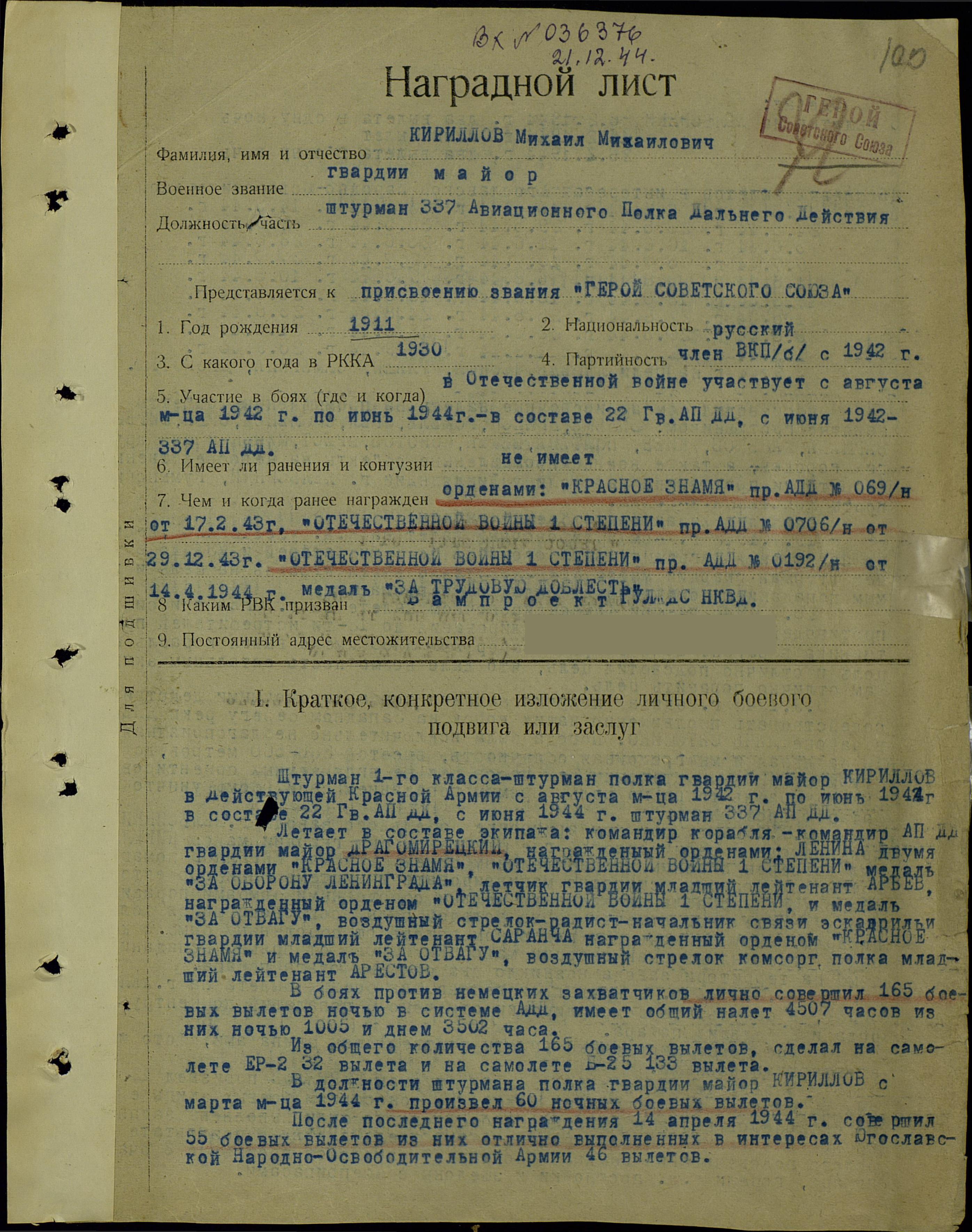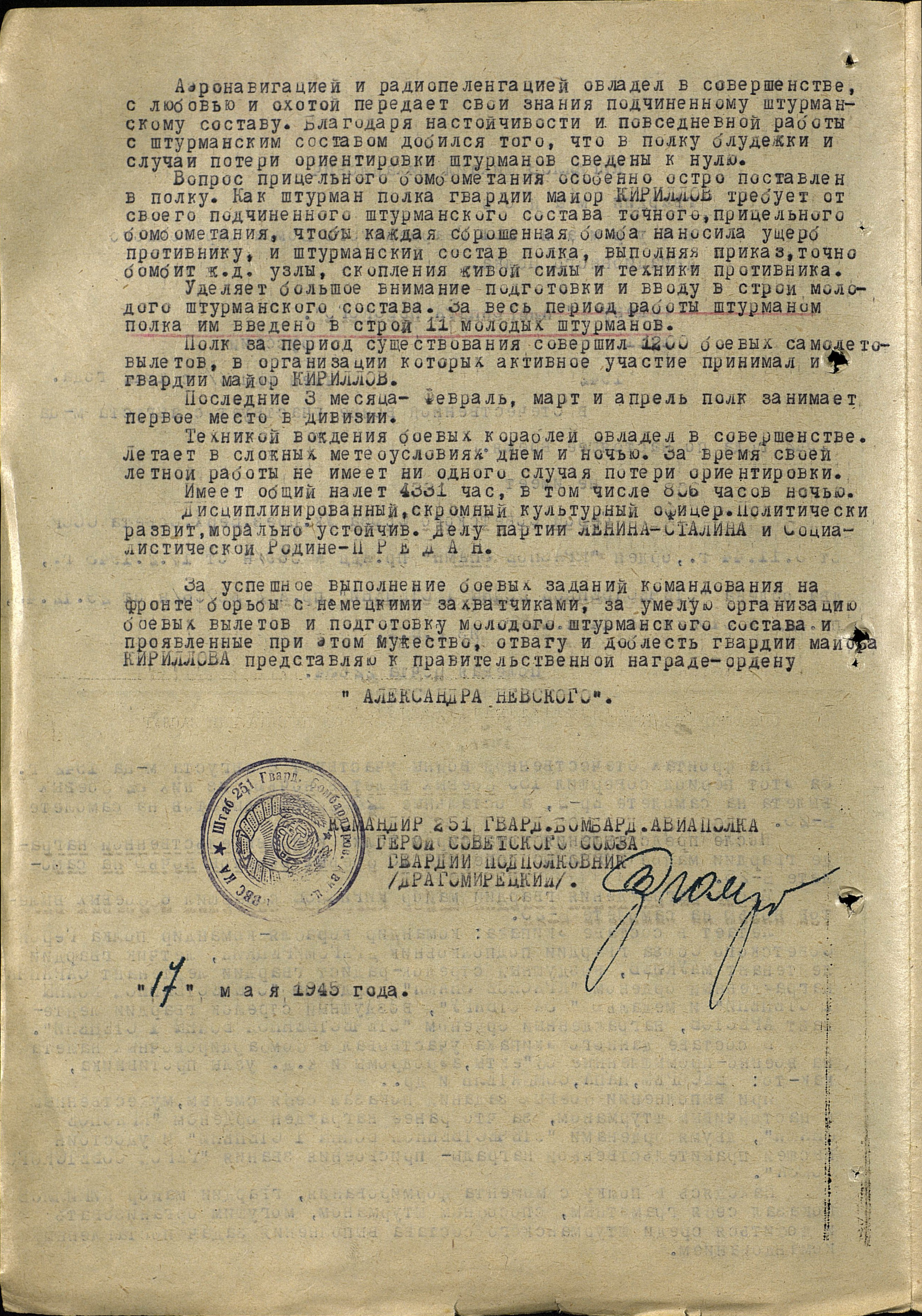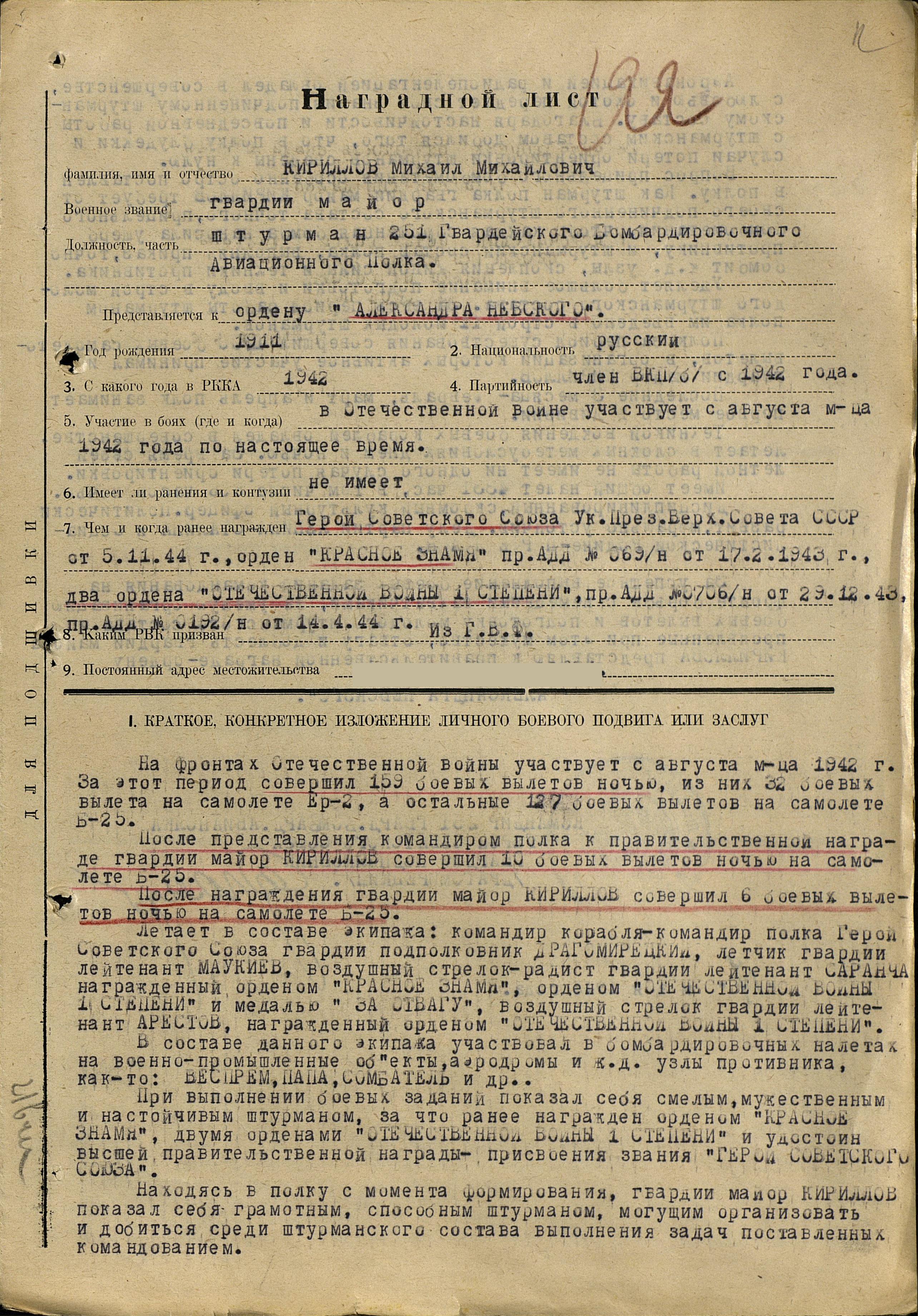 Кириллов Михаил Михайлович - штурман 337-го авиационного полка (5-я гвардейская авиационная дивизия, 4-й гвардейский авиационный корпус, Авиация дальнего действия), гвардии майор.