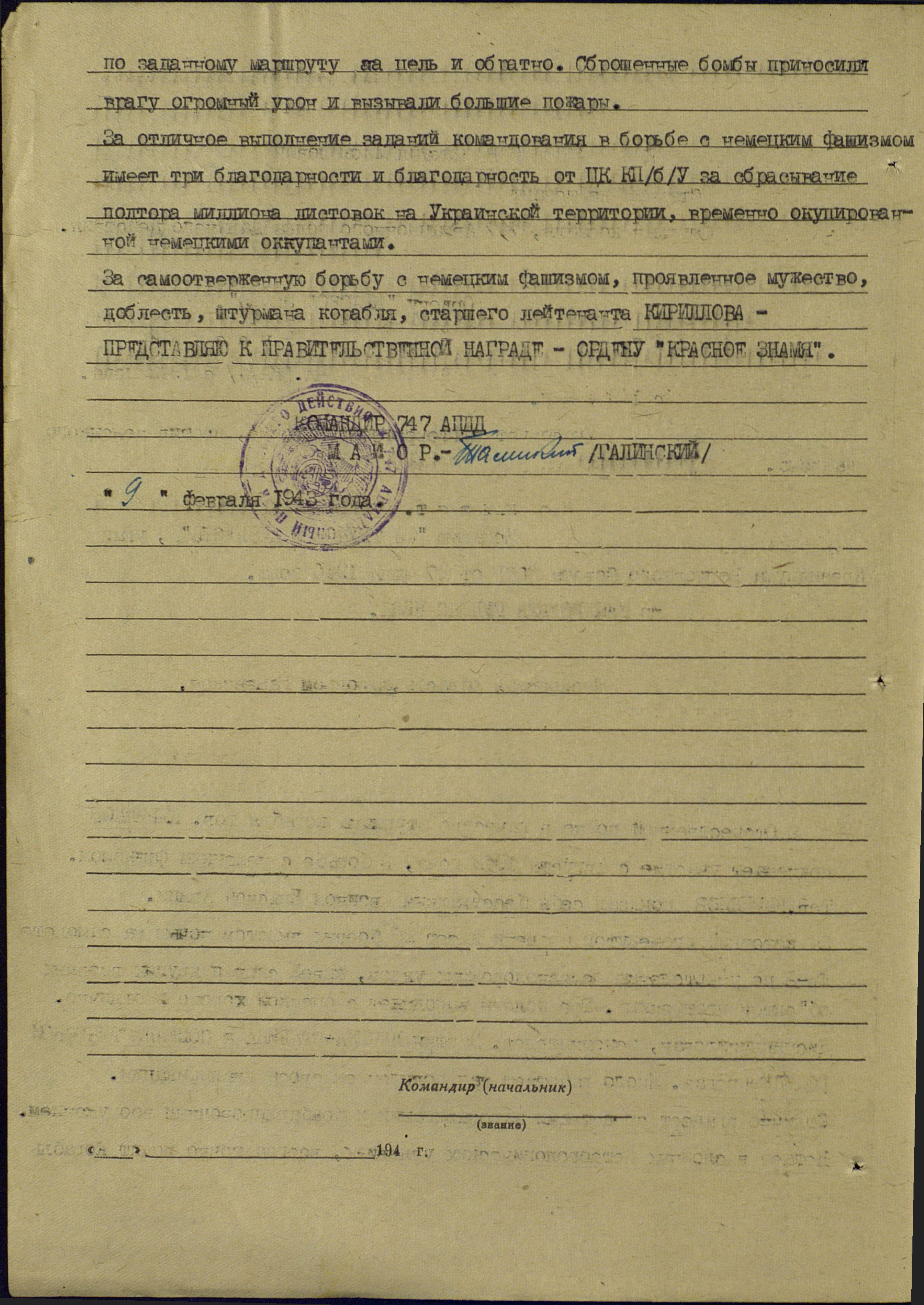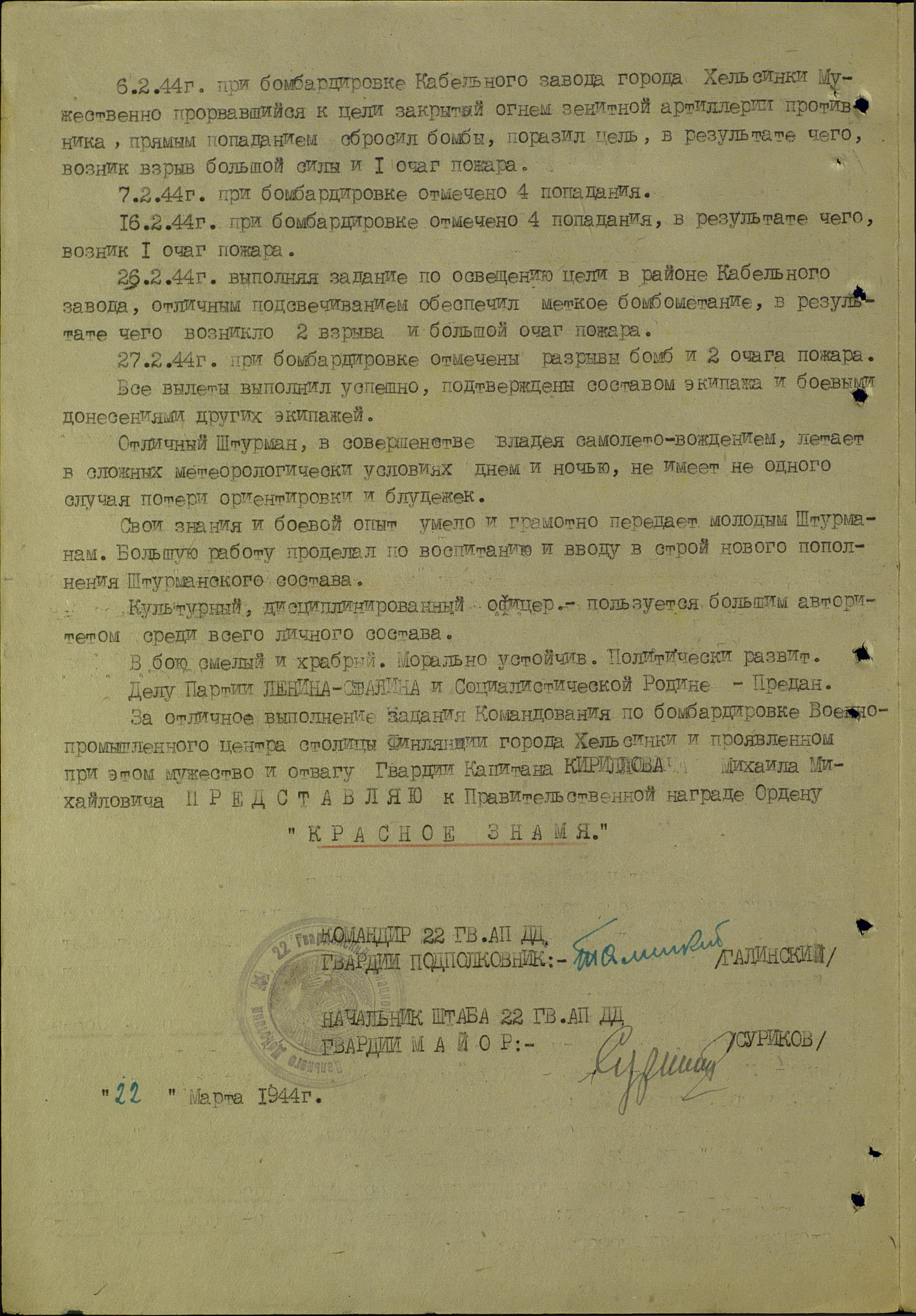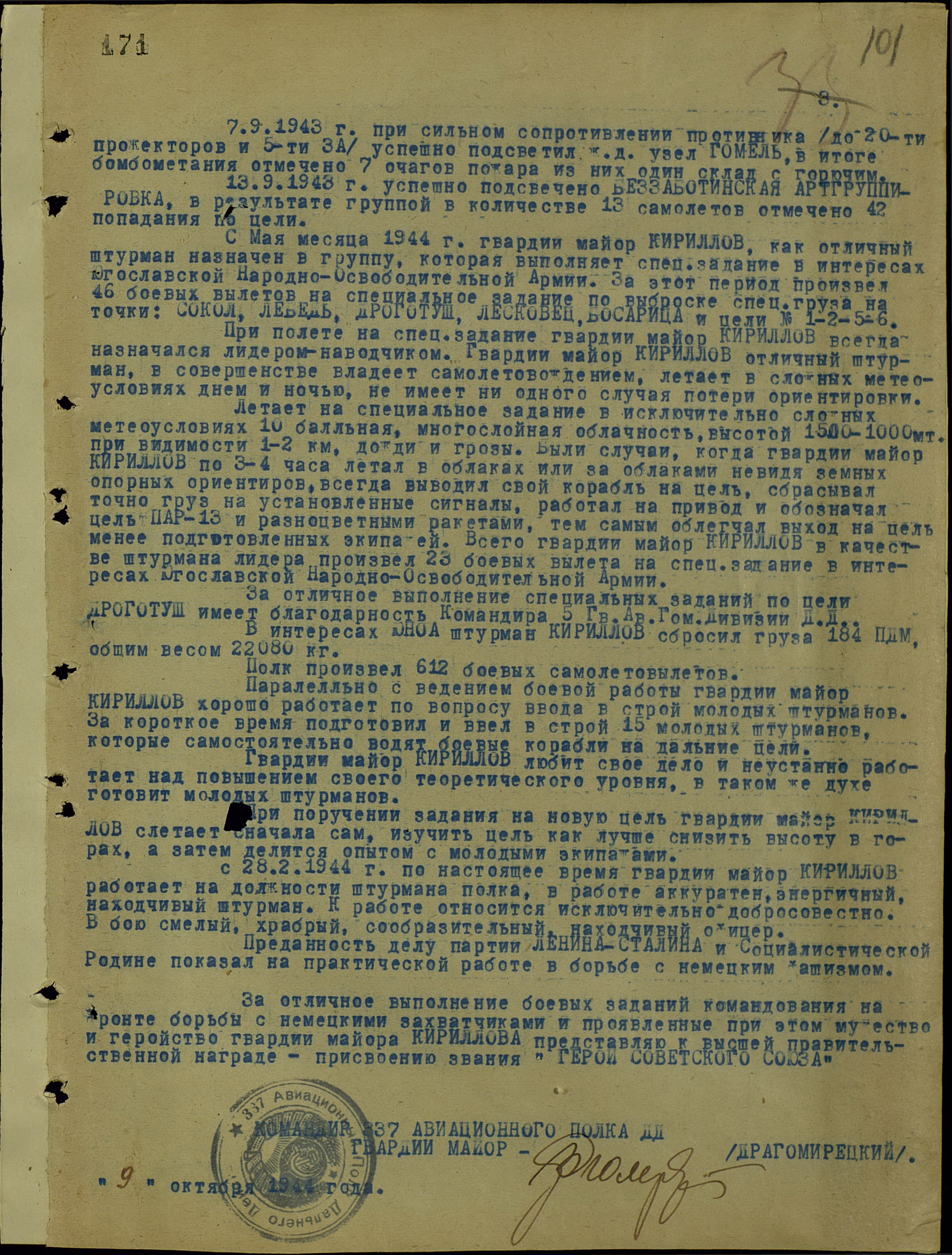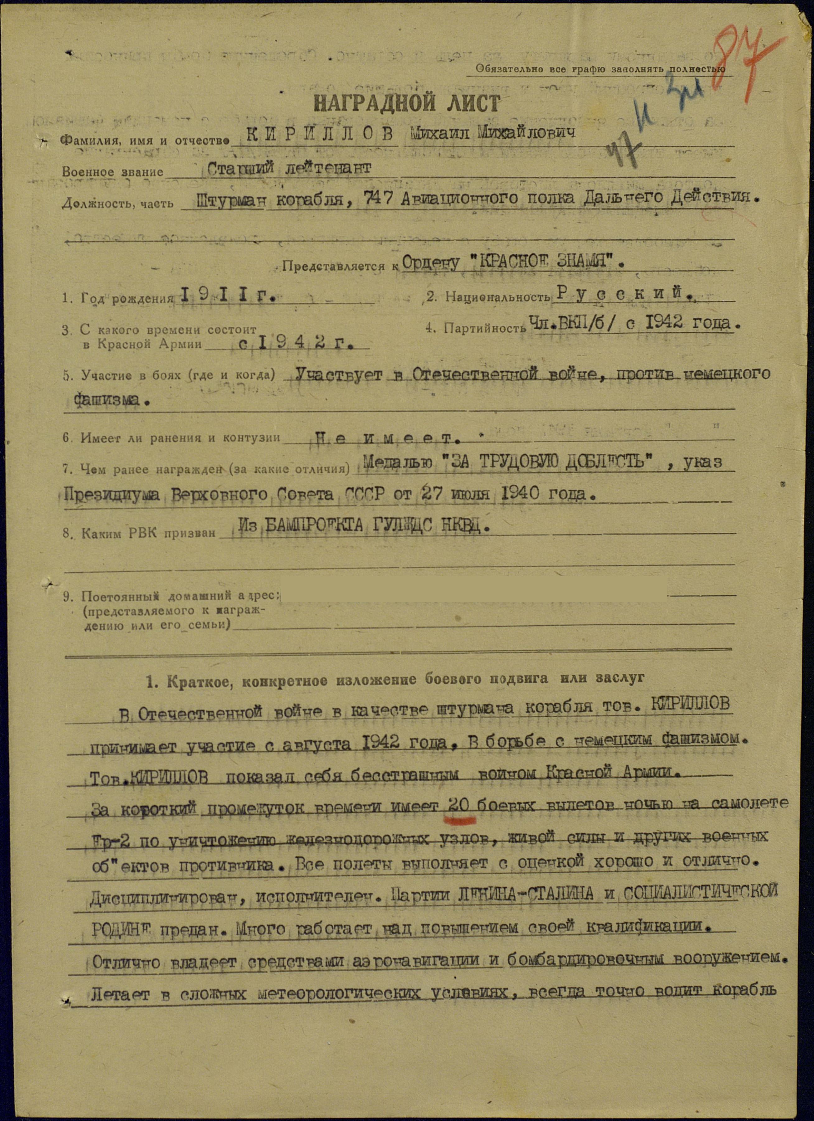 Кириллов Михаил Михайлович - штурман 337-го авиационного полка (5-я гвардейская авиационная дивизия, 4-й гвардейский авиационный корпус, Авиация дальнего действия), гвардии майор.