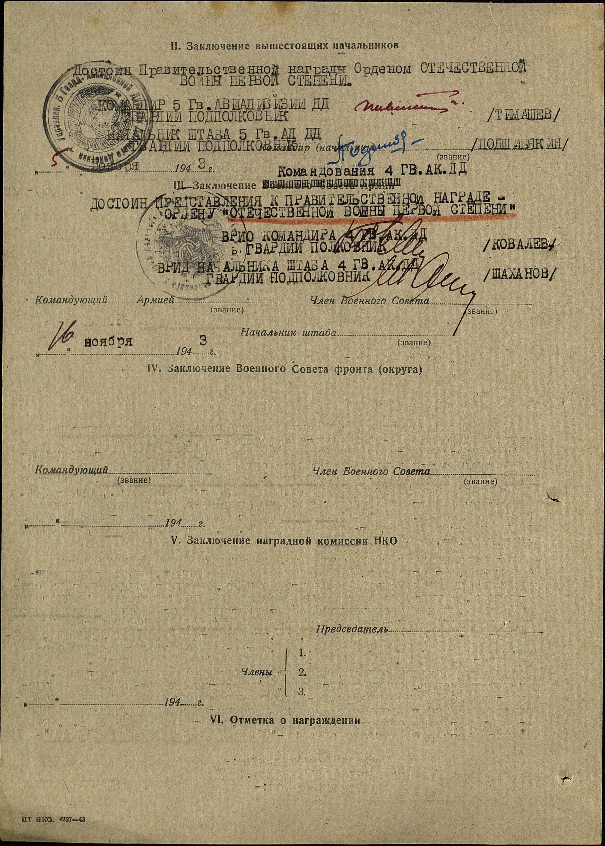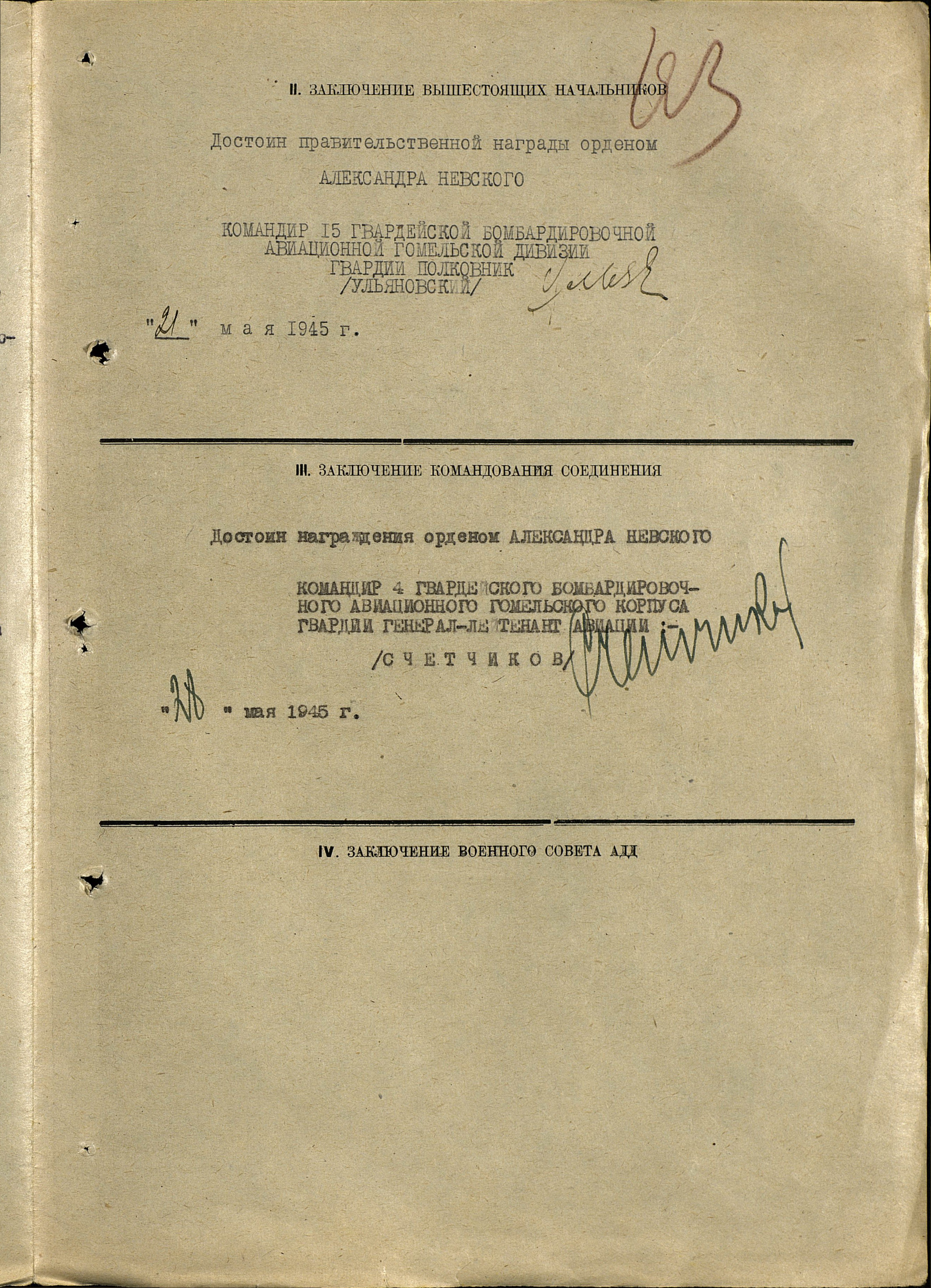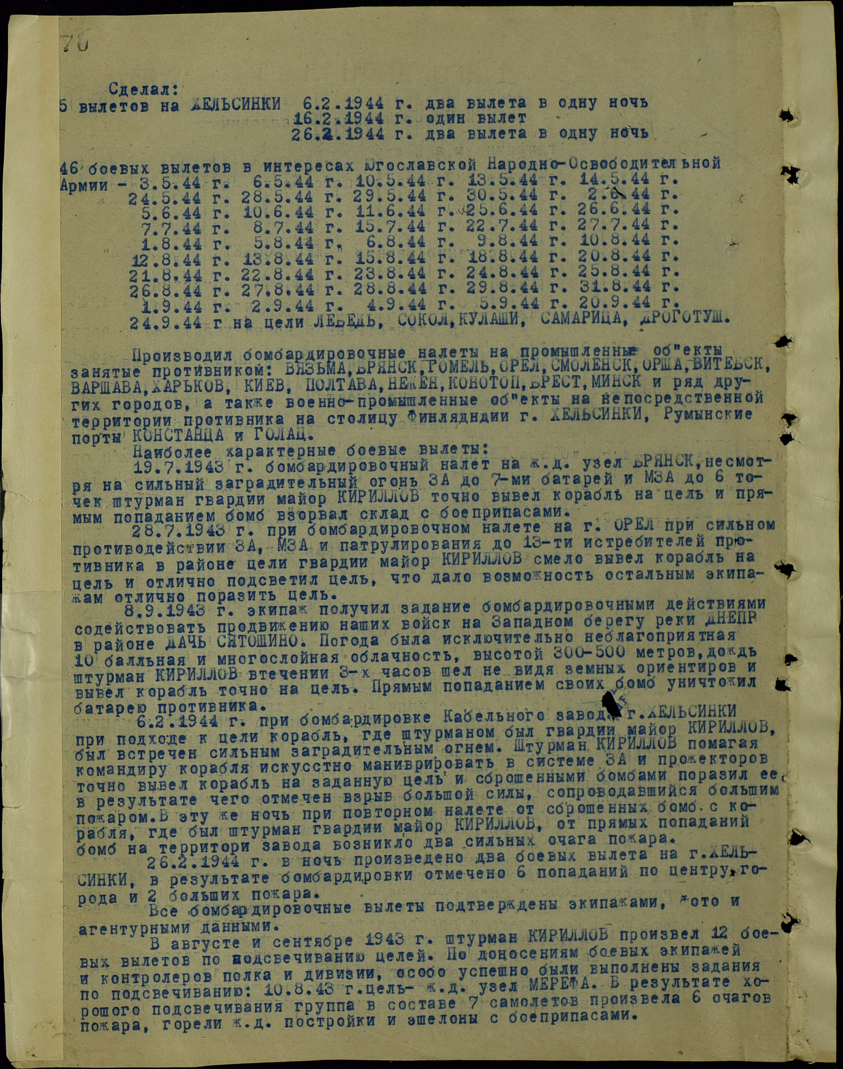 К октябрю 1944 года совершил 165 боевых вылетов на бомбардировку военно-промышленных объектов в глубоком тылу противника, скоплений его войск.