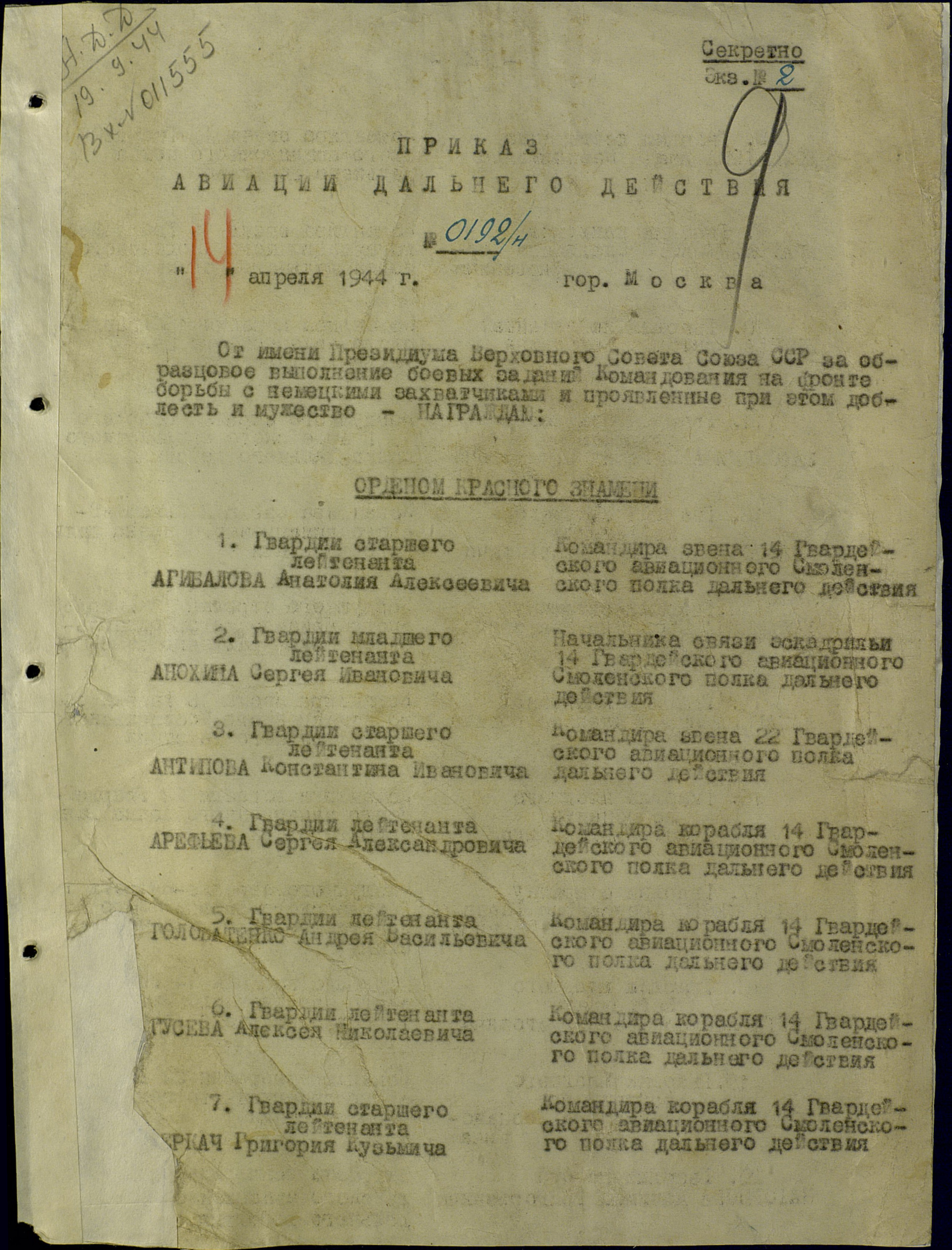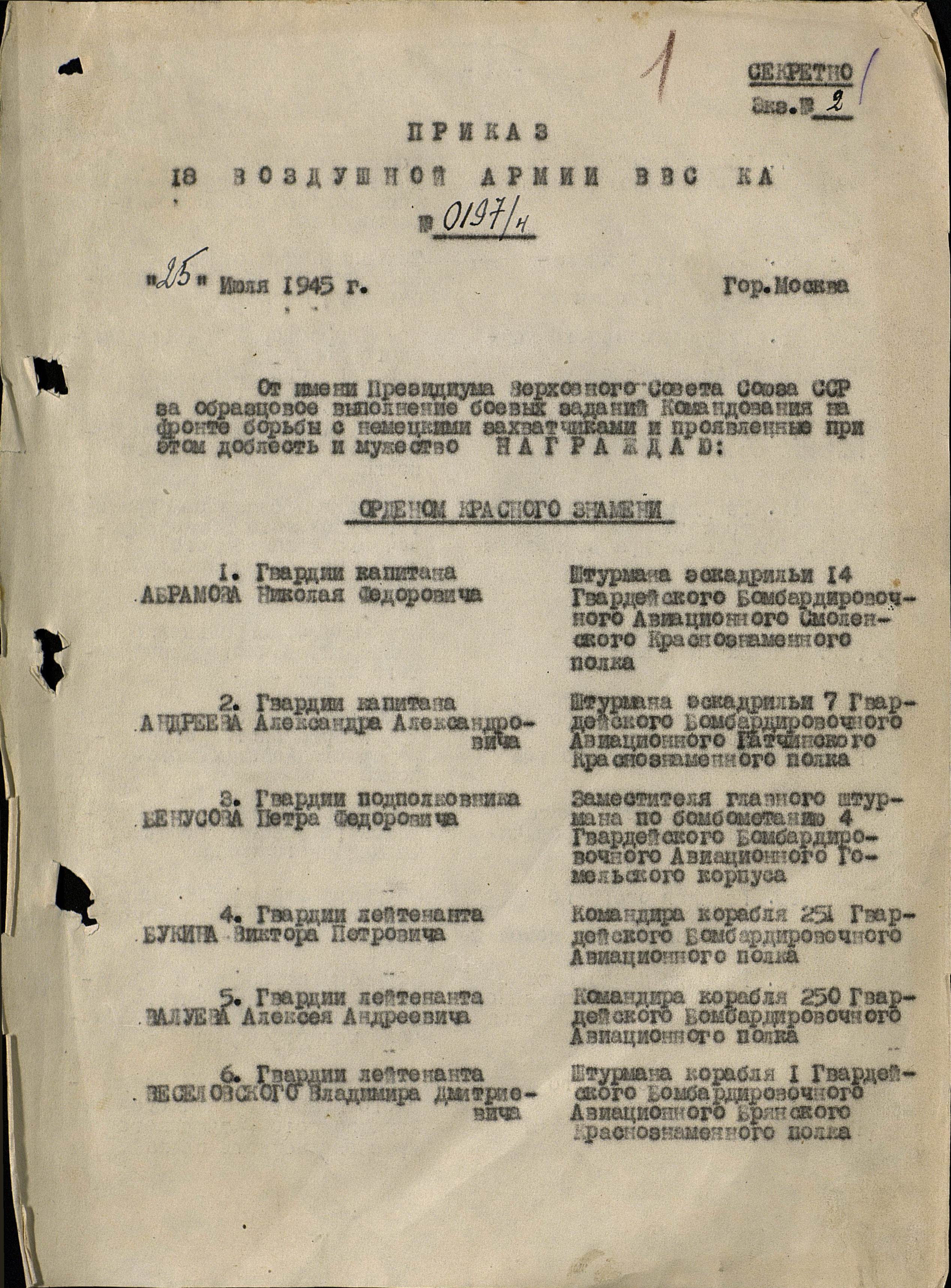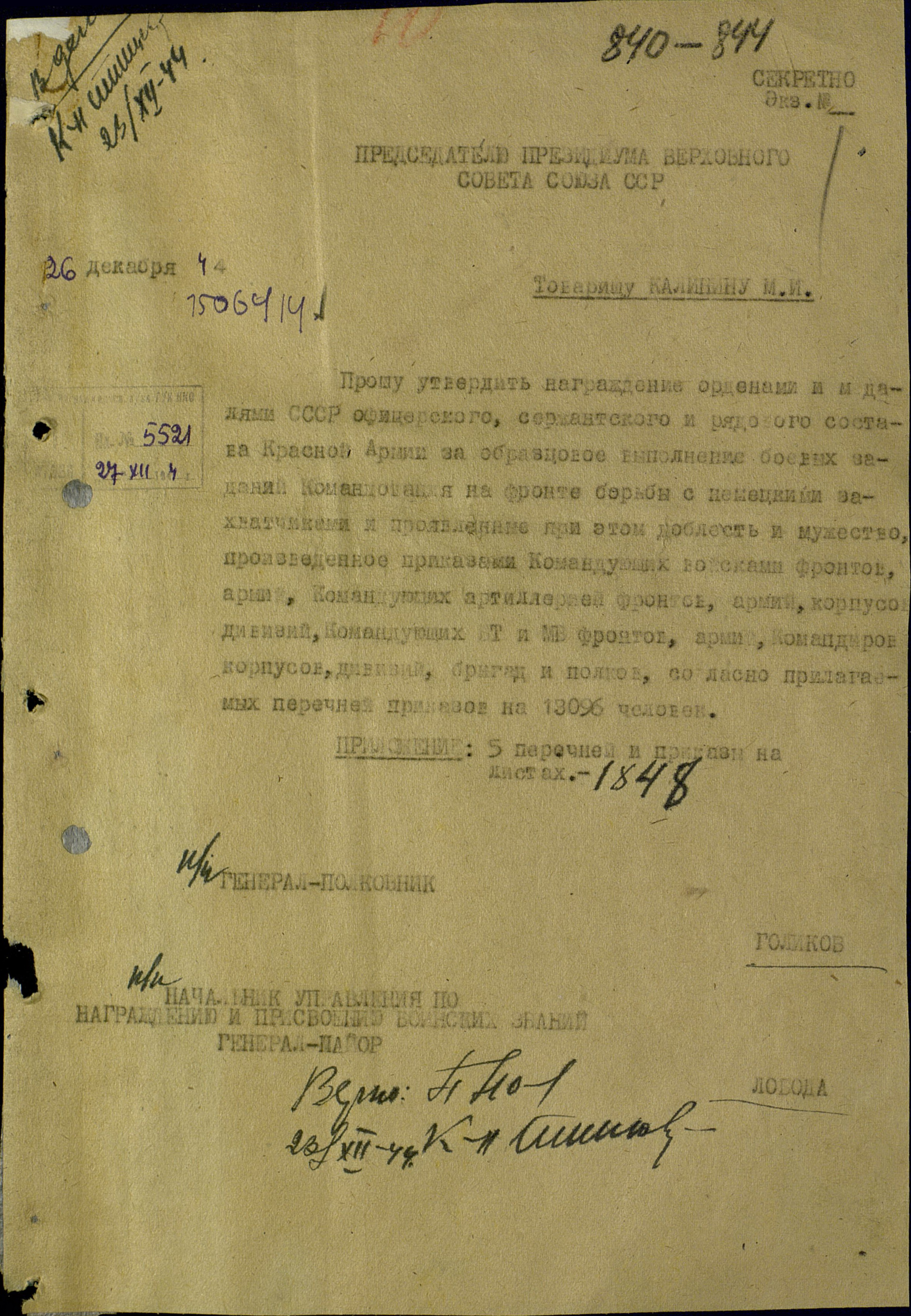 1. 05.11.1944 Медаль № 5284