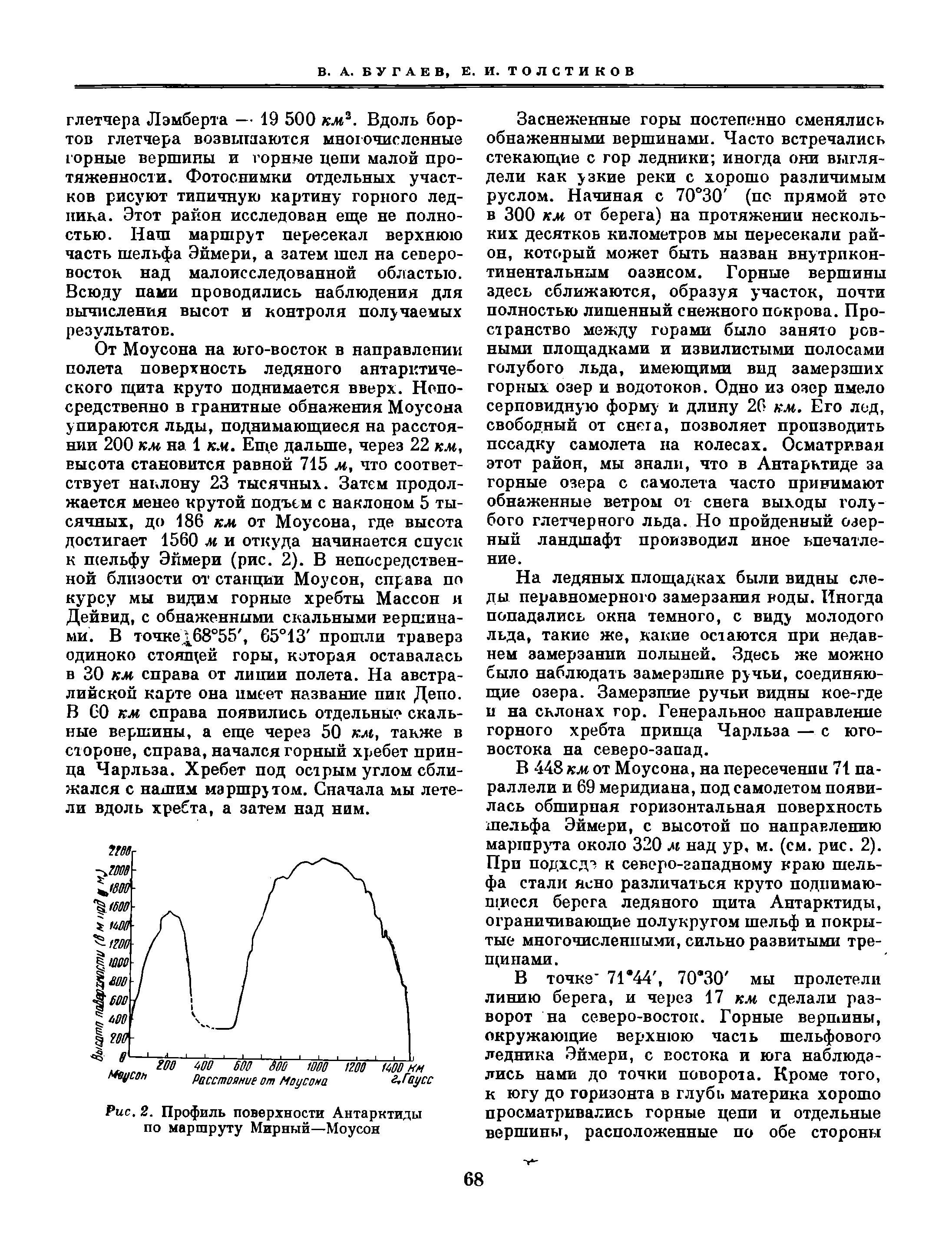 2. Впервые был осуществлен гляциологический разрез от побережья моря Дейвиса до Полюса относительной недоступности протяженностью более 2100 км. Этот разрез был выполнен в начале и конце 1958 г. тремя санногусеничными поездами. Сопоставление данных сейсмического зондирования ледниковой толщи с результатами гравиметрических работ позволило построить подледный профиль Восточной Антарктиды.