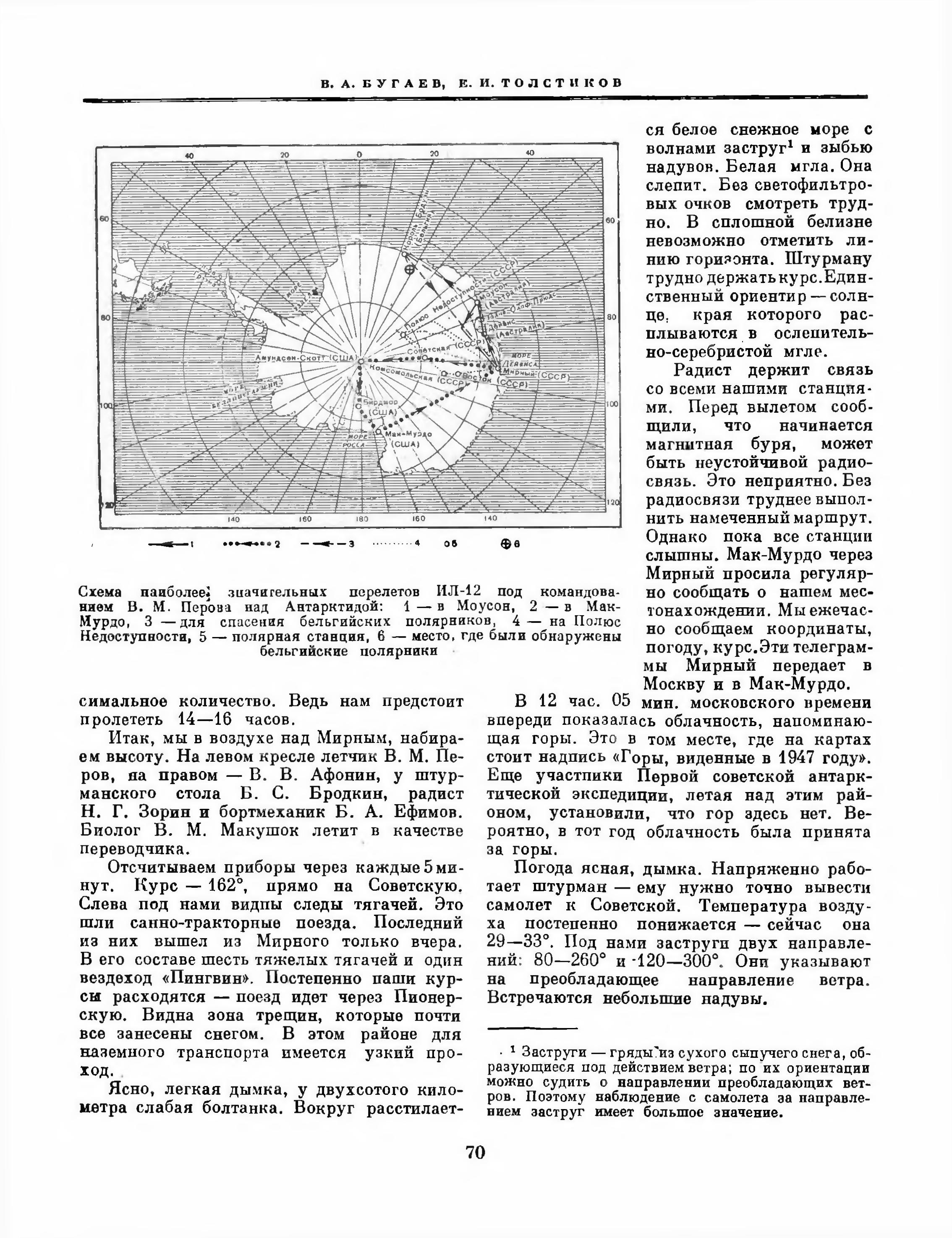 В 5 час. 30 мин. местного времени при ясной погоде и полной луне тяжелый самолет ИЛ-12 под командованием В. М. Перова, при штурмане Бродкине, после продолжительного разбега по припаю поднимается в воздух. Берем курс на запад-юго-запад, в направлении австралийской станции Дейвис (рис. 1). Вначале идем над припаем моря Дейвиса, затем под нами появляется прибрежная часть антарктического склона, имеющего здесь неровный, волнистый характер. Пересекаем покрытые трещинами мысы