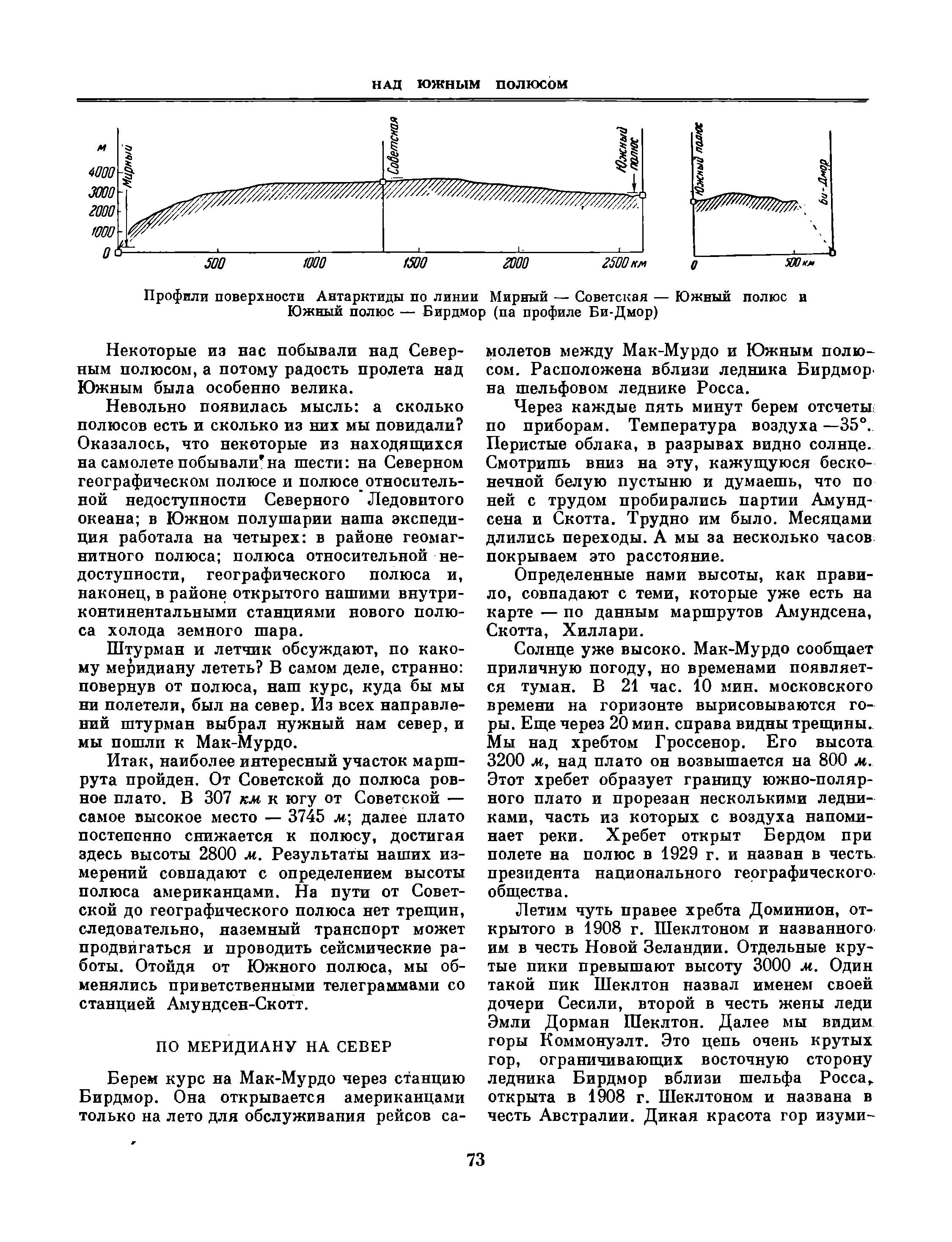 Наш маршрут лежал из Мак-Мурдо прямо в Мирный над плато Восточной Антарктиды. В Мак-Мурдо сообщили, что в этих районах летали американские самолеты; Дюфек летал из Мак-Мурдо к берегу Бадда. Максимальная высота поверхности здесь около 3000 м. Но нигде нанесенных на карту высот этой части Антарктиды мы не видели. Поэтому хотелось промерить высоты материка. Нашему самолету предстояло пересечь горный хребет. Делаем над Мак-Мурдо круг для набора высоты, после чего ложимся на курс. Погода ясная. Идем над горами, легкая болтанка. Набираем высоту. Иногда вершины гор выше нас. Идем над ледником Феррар, высота полета 3200 м. Ледник красивый, течет, как река. У ледников не видно морен. Окружающие горы коричневые, светло-коричневые и розово-коричневые, с горизонтальными слоями. Затем проходим над ледником Тейлора. Его длина 35 миль, ширина — 2—10 миль, он заканчивается «Сухой Долиной»— своеобразным оазисом, образованным при отступании ледника. Левее видна массивная оканчивающаяся острым пиком гора Листер высотою около 4000 м.