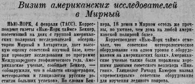 НЬЮ-ЙОРК, 4 февраля (ТАСС). Корреспондент газеты «Нью-Йорк таймс» Беккер, посетивший на днях с группой американских полярных исследователей обсерваторию Мирный в Антарктиде, дает высокую оценку советской научной базе, которая приводит исследования по программе Международного геофизического года. Американские ученые, сообщает Беккер, — «обнаружили, что в области океанографии, метеорологии и гляциологии русские достигли больших успехов». По словам Беккера, 18 домов в Мирном «столь же прочны, но уютнее, чем дома на любой американской полярной базе».