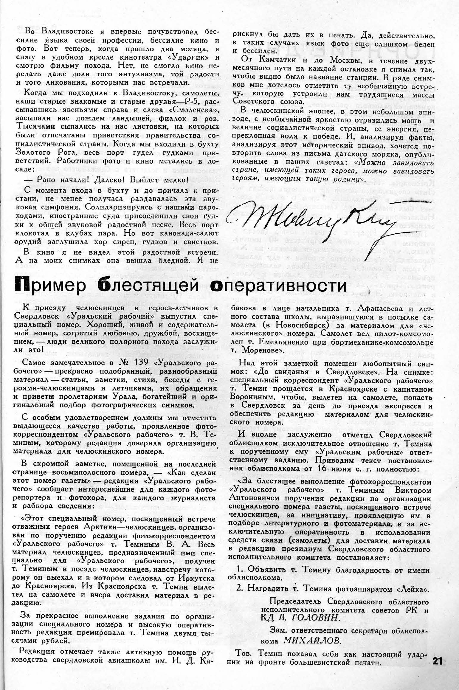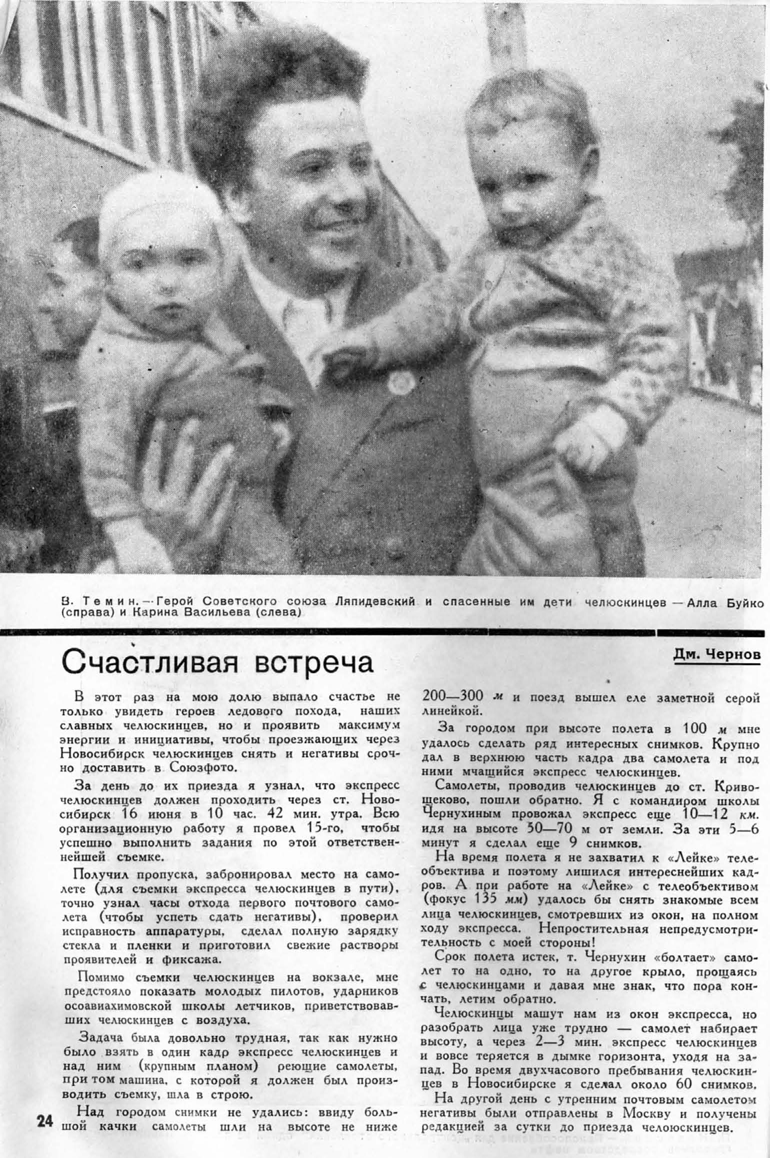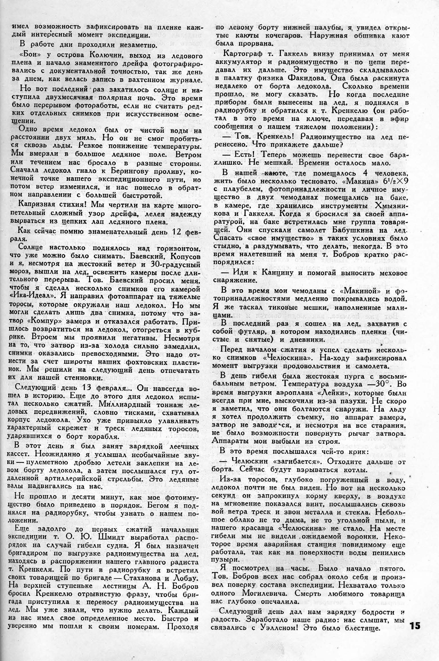 — Когда весной этого года мы узнали о положении лагеря Шмидта, а также о пребывании в г. Фербенксе Ушакова, Слепнёва и Леваневского, мы отправились к ним в гостиницу предложить свой авиационный опыт для спасения челюскинцев. Наше предложение было принято.