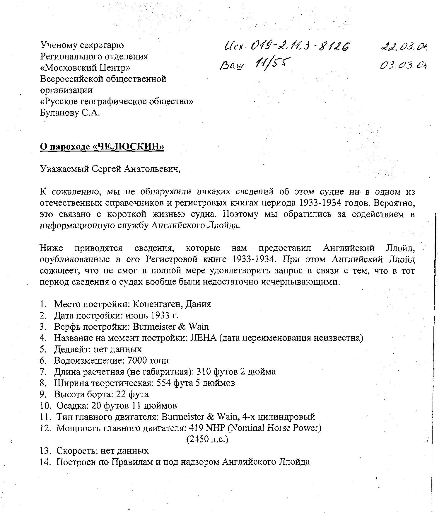 К сожалению, мы можем сообщить Вам каких-либо дополнительных технических данных об этом пароходе кроме тех, которые были направлены Вам ранее (прилагается наш № 019-2.11.3-8126 от 22-03-2004 в качестве ответа на Ваш № 11/55 от 03-03-2004).