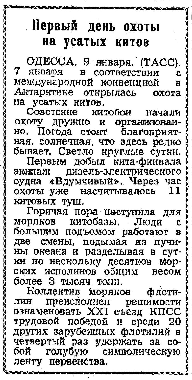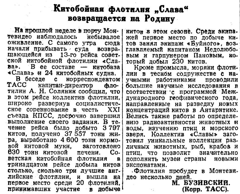В беседе с корреспондентом ТАСС капитан-директор флотилии А. И. Соляник заявил, что, находясь более полугода в суровых метеорологических условиях Антарктики, советские китобои успешно выполнили стоящие перед ними задачи. Охота не прекращалась даже в шторм, при ветре в 10 баллов. Широкий размах во время промысла приобрели социалистическое соревнование и борьба за выполнение плана. Первое место в соревновании заняло китобойное судно «Слава-5», капитаном которого является Абессолом Зенаишвили, гарпунером — Алексей Золотов. Всего флотилия убила более 3 тысяч китов и собрала свыше 30 тысяч тонн китового жира и других продуктов.