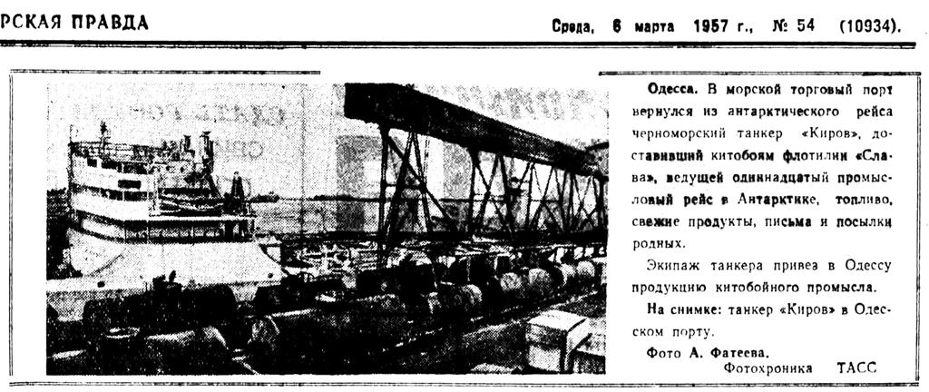 Одесса. В морской торговый порт вернулся из антарктического рейса черноморский танкер «Киров», доставивший китобоям флотилии «Слава», ведущей одиннадцатый промысловый рейс в Антарктике, топливо, свежие продукты, письма и посылки родных.