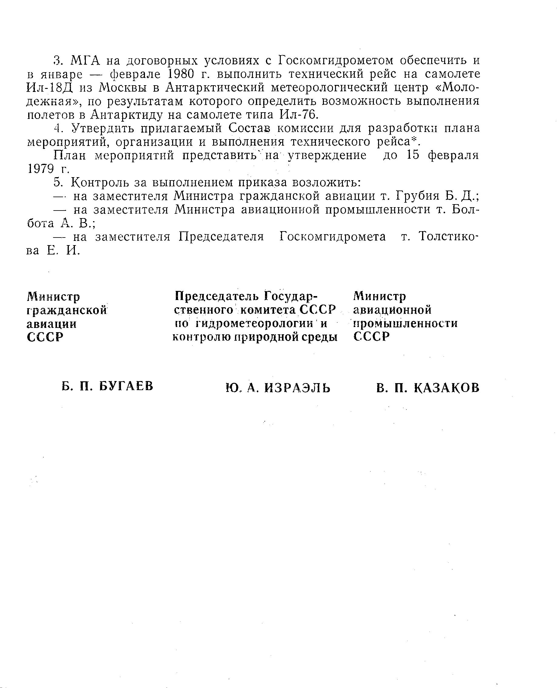 По сути, рейс был пробный - для того, чтобы оценить всю ситуацию по маршруту, а также состояние взлетно-посадочной полосы на аэродроме станции Молодежная и в будущем открыть полеты на самолете ИЛ-76. В связи с этим мною было принято решение, что в этот полет полетит Шишкин Жорж Константинович, который в это время был ведущим специалистом управления летной службы по самолету ИЛ-76, с тем, чтобы со знанием дела оценить всю ситуацию и выполнить последующий полет на самолете ИЛ-76. Вылетели мы с удвоенным экипажем - командирами кораблей были внуковцы, Денисов и Бунчиков. По пути экипаж Бунчикова был оставлен в Адене. Дальнейшую часть полета выполнял экипаж Денисова, с ведущим специалистом - Шишкиным Жоржем Константиновичем. На борту было много радио-и тележурналистов.
