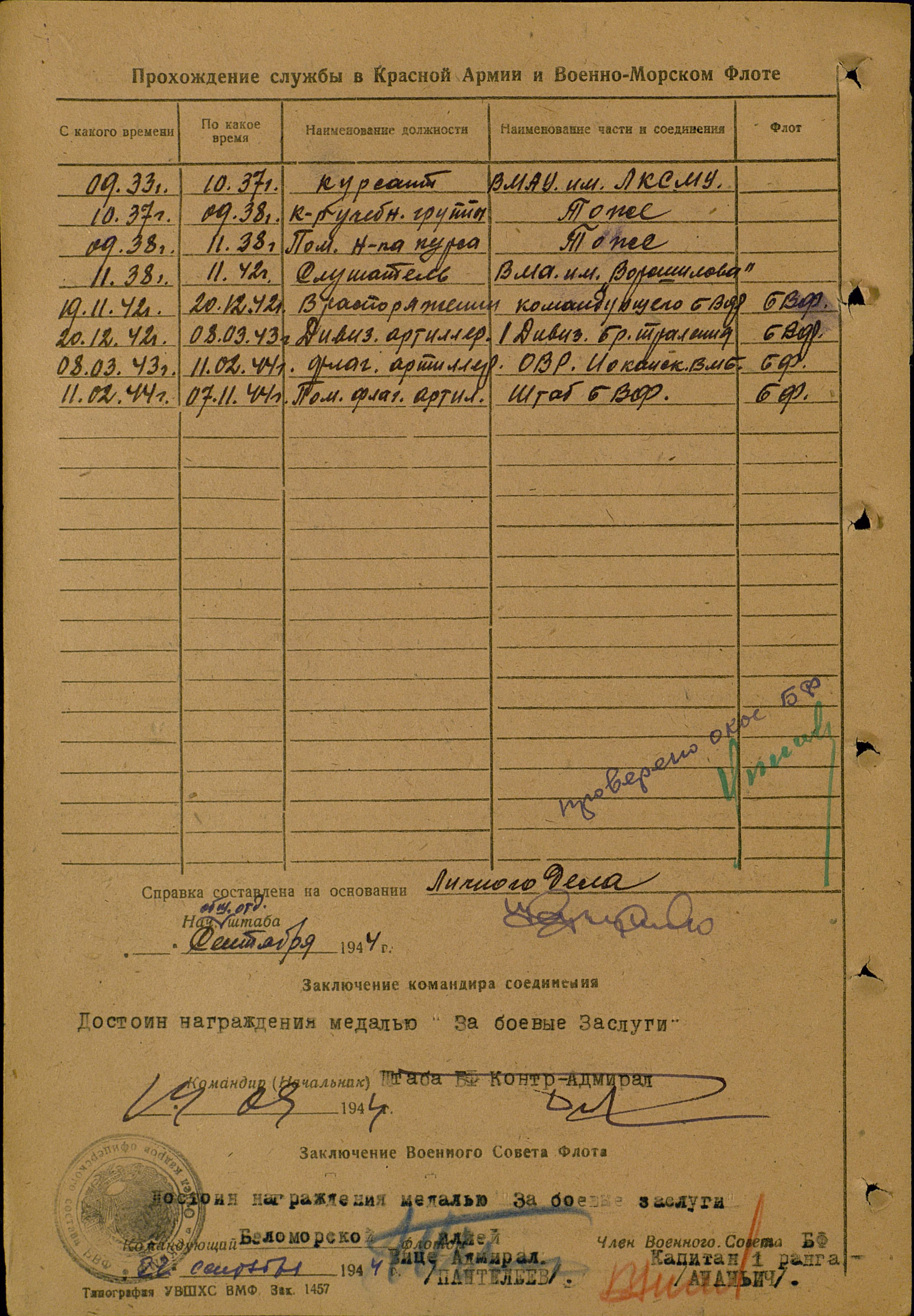 Предан партии Ленина-Сталина и Социалистической Родине. Инициативный, энергичный, хорошо грамотный артиллерист. Хорошо руководит проектировкой арт. частей кораблей. Работает над повышением своего уровня как специалиста. Склонен к научно-исследовательской работе.