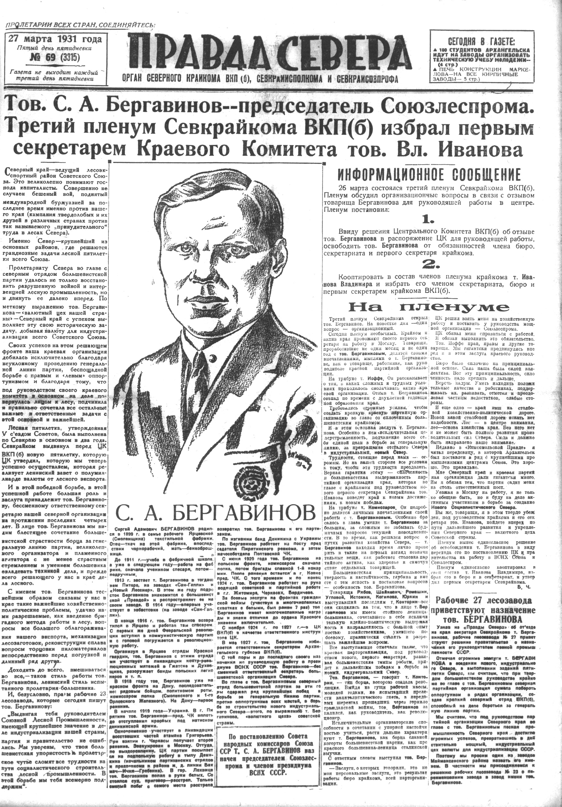 "Правда Севера" к отъезду т. Бергавинова помещает ряд статей. В передовой «Правда Севера» пишет:
