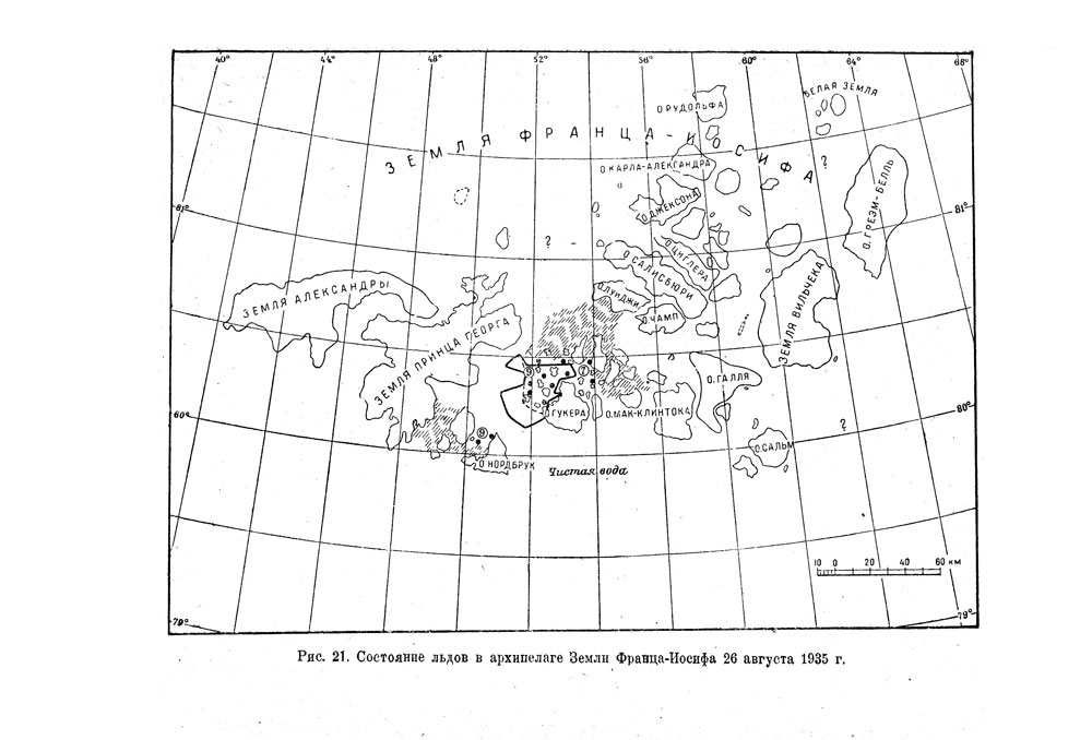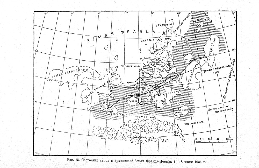 Из книги "Наблюдения над состоянием льда в арктичеcких морях в зиму 1934/35 года и в навигацию 1935 года". Под общей редакцией проф. В. Ю. Визе и Н. И. Евгенова. Изд. ГУСМП, Л: 1937