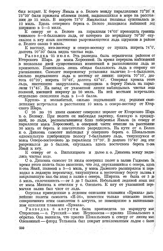 Дойдя до середины этой семьи, мы повернули круто на север. Однако, далеко уйти не удалось. В 10 ч. 30 мин. вечера остановились, чтобы отправить на воздушную разведку самолет. Наше счисление- 80о52" и 20о32". Столь северно в это раннее время года здесь еще никто не плавал ("Персей" в прошлом году с Зубовым плыл здесь в конце августа- начале сентября: "Льду было значительно меньше"). А сейчас к северу, востоку и северо-западу - сплошной лед, мощности до 10 баллов, с торосистыми нагромождениями. Ребята, обрадовавшись остановке, вышли на лед и выехали в резиновом гондоле пострелять (Виленский, Володарский, Шишкин). Днем такую же экскурсию - первую за нашу экспедицию- проделали Бабушкин, Дубравин, Факидов, Варламов и матрос Сергеев. Изредка мелькают тюлени, сидят глупыши.