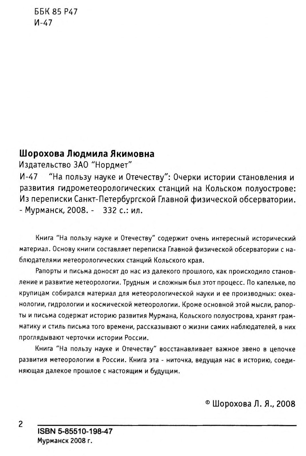 Шорохова, Л. Я. "На пользу науке и Отечеству" : очерки истории становления и развития гидрометеорологических станций на Кольском полуострове : из переписки Санкт-Петербургской Главной физической обсерватории / Л. Я. Шорохова ; [ред.: Игнатов М. Т.]. - Изд. 2-е перераб., доп. - Мурманск : Нордмет, 2008. - 332 с.