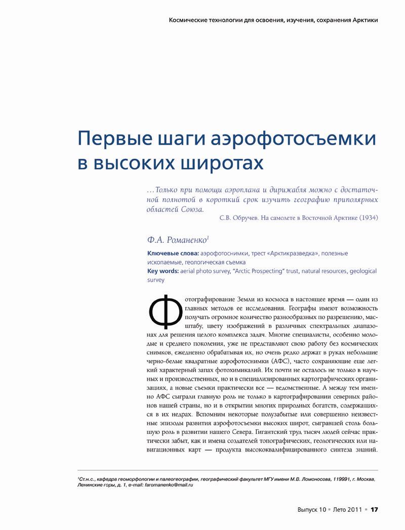 (Ст.н.с., кафедра геоморфологии и палеогеографии, географический факультет МГУ имени М. В. Ломоносова, 119991, г. Москва, Ленинские горы, д. 1, e-mail: faromanenko@mail. ru)Фотографирование Земли из космоса в настоящее время — один из главных методов ее исследования. Географы имеют возможность получать огромное количество разнообразных по разрешению, масштабу, цвету изображений в различных спектральных диапазонах для решения целого комплекса задач. Многие специалисты, особенно молодые и среднего поколения, уже не представляют свою работу без космических снимков, ежедневно обрабатывая их, но очень редко держат в руках небольшие черно-белые квадратные аэрофотоснимки (АФС), часто сохраняющие еще легкий характерный запах фотохимикалий. Их почти не осталось не только в научных и производственных, но и в специализированных картографических организациях, а новые съемки практически все — ведомственные. А между тем именно АФС сыграли главную роль не только в картографировании северных районов нашей страны, но и в открытии многих природных богатств, содержащихся в их недрах. Вспомним некоторые полузабытые или совершенно неизвестные эпизоды развития аэрофотосъемки высоких широт, сыгравшей столь большую роль в развитии нашего Севера. Гигантский труд тысяч людей сейчас практически забыт, как и имена создателей топографических, геологических или навигационных карт — продукта высококвалифицированного синтеза знаний.
