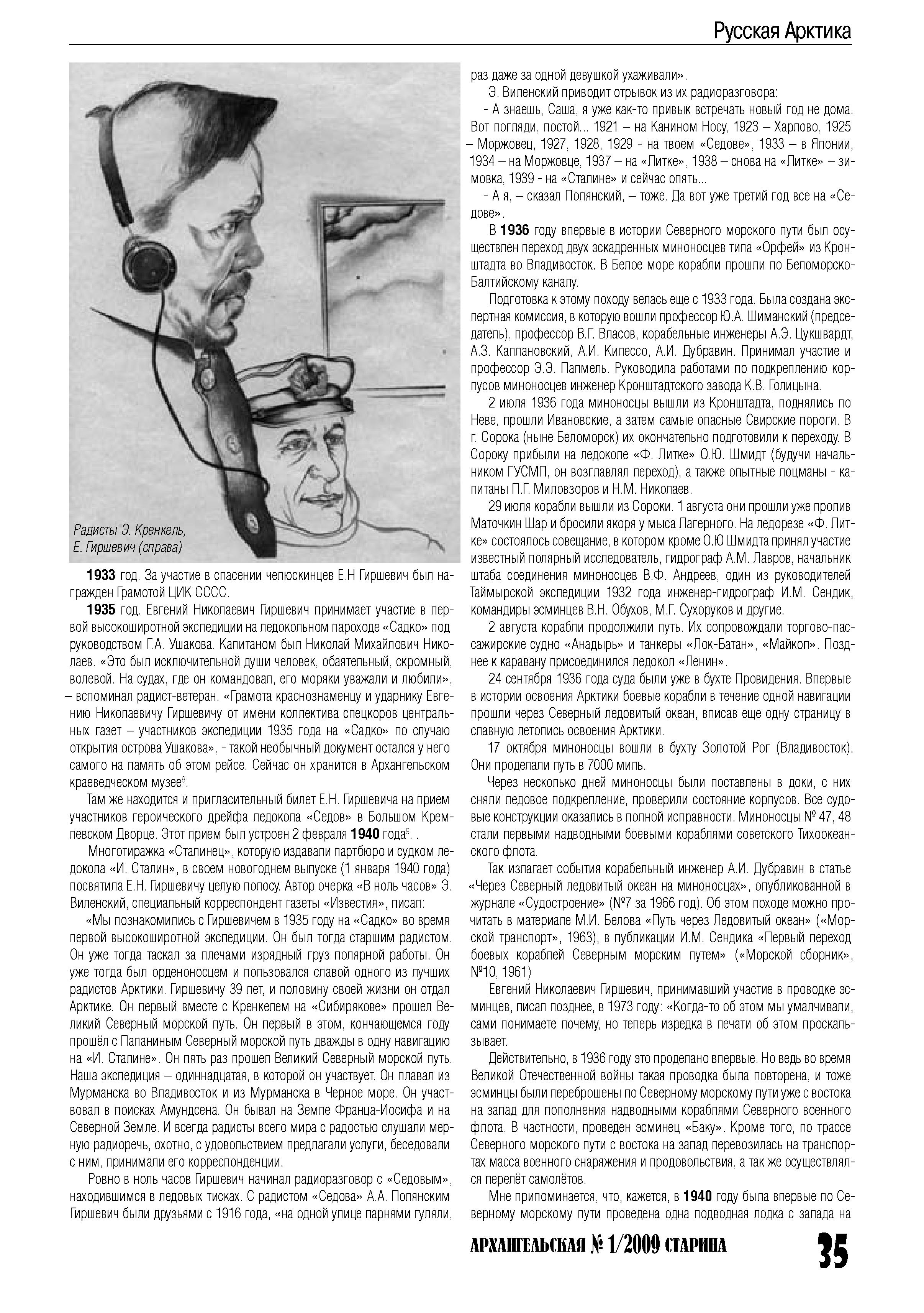 «Мы познакомились с Гиршевичем в 1935 году на «Садко» во время первой высокоширотной экспедиции. Он был тогда старшим радистом. Он уже тогда таскал за плечами изрядный груз полярной работы. Он уже тогда был орденоносцем и пользовался славой одного из лучших радистов Арктики. Гиршевичу 39 лет, и половину своей жизни он отдал Арктике. Он первый вместе с Кренкелем на «Сибирякове» прошел Великий Северный морской путь. Он первый в этом, кончающемся году прошёл с Папаниным Северный морской путь дважды в одну навигацию на «И. Сталине». Он пять раз прошел Великий Северный морской путь. Наша экспедиция – одиннадцатая, в которой он участвует. Он плавал из Мурманска во Владивосток и из Мурманска в Черное море. Он участвовал в поисках Амундсена. Он бывал на Земле Франца-Иосифа и на Северной Земле. И всегда радисты всего мира с радостью слушали мерную радиоречь, охотно, с удовольствием предлагали услуги, беседовали с ним, принимали его корреспонденции.