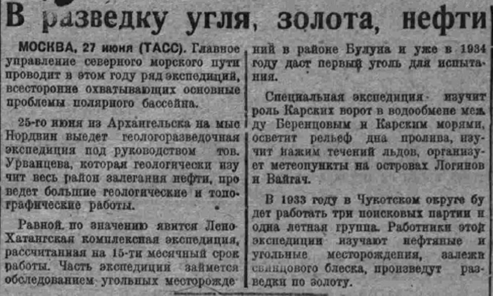 25-го нюня из Архангельска на мыс Нордвик выедет геологоразведочная экспедиция под руководством тов. Урванцева, которая геологически изучит весь район залегания нефти, проведет большие геологические и топографические работы.
