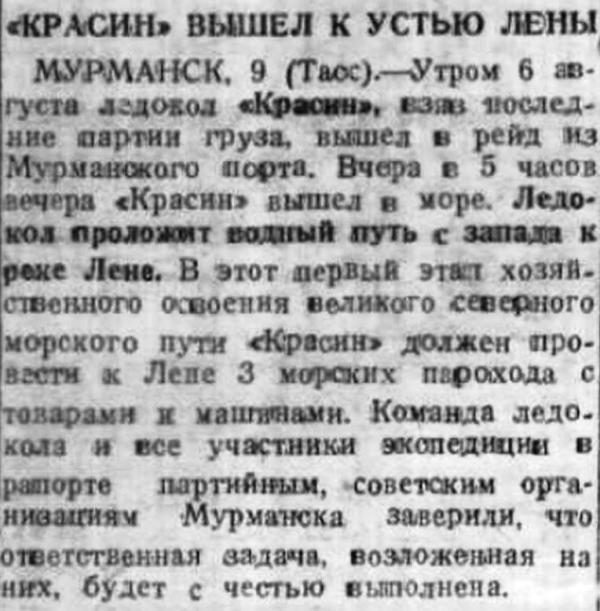 МУРМАНСК. 9 (Тасс). — Утром 6 августа ледокол "Красин", взяв последние партии груза, вышел в рейд из Мурманского порта. Вчера в 5 часов вечера «Красин» вышел в море. Ледокол проложит водный путь с запада к реке Лене. В этот первый этап хозяйственного освоения великого северного морского пути "Красин" должен провести к Лене 3 морских парохода с товарами и машинами. Команда ледокола и все участники экспедиции в рапорте партийным, советским организациям Мурманска заверили, что ответственная задача, возложенная на них, будет с честью выполнена.