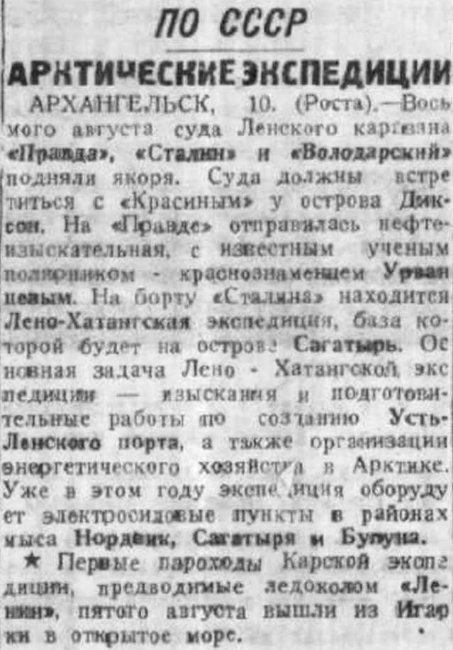 АРХАНГЕЛЬСК. 10. (Роста). — Восьмого августа суда Ленского каравана «Правда», «Сталин» и «Володарский» подняли якоря. Суда должны встретиться с «Красиным» у острова Диксон. На «Правде» отправилась нефте-изыскательная, с известным ученым полярником - краснознаменцем Урванцевым. На борту «Сталина» находится Лено-Хатангская экспедиция, база которой будет на острове Сагастырь Основная задача Лено-Хатангской экспедиции — изыскания и подготовительные работы по созданию Усть-Ленского порта, а также организации энергетического хозяйства в Арктике. Уже в этом году Экспедиция оборудует электросиловые пункты к районах мыса Нордвик, Сагастыря и Булуна.