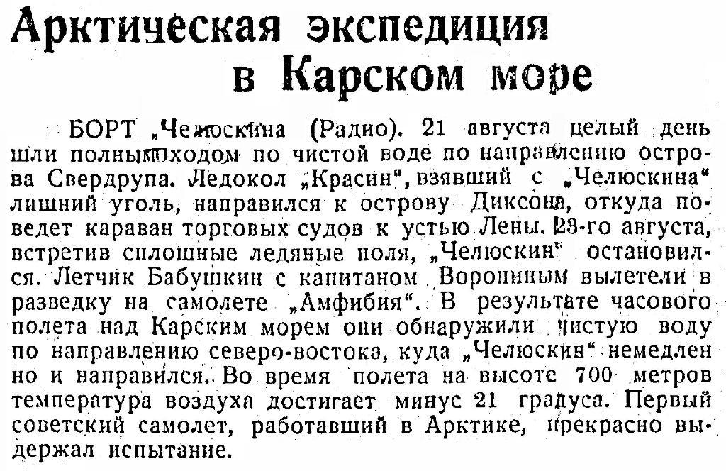 БОРТ "Челюскина" (Радио). 21 августа целый день шли полным ходом по чистой воде по направлению острова Свердрупа. Ледокол „Красин", взявший с "Челюскина" лишний уголь, направился к острову Диксона, откуда поведет караван торговых судов к устью Лени. 23-го августа, встретив сплошные ледяные поля, „Челюскин" остановился. Летчик Бабушкин с капитаном Ворониным вылетели в разведку на самолете „Амфибия". В результате часового полета над Карским морем они обнаружили чистую воду по направлению северо-востока, куда „Челюскин", немедленно и направился. Во время полета на высоте 700 метров температура воздуха достигает минус 21 градуса. Первый советский самолет, работавший в Арктике, прекрасно выдержал испытание.