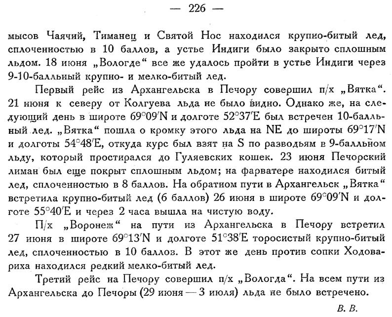 Первый рейс из Архангельска в Печору совершил п/х „Вятка". 21 июня к северу от Колгуева льда не было видно. Однако же, на следующий день в широте 69°09 N и долготе 52°37'Е был встречен 10-балльный лед. „Вятка“ пошла о кромку этого льда на NE до широты 69°17'N и долготы 54º48'Е, откуда курс был взят на S по разводьям в 9-балльном льду, который простирался до Гуляевских кошек. 23 июня Печорский лиман был еще покрыт сплошным льдом; на фарватере находился битый лед, сплоченностью в 8 баллов. На обратном пути в Архангельск „Вятка" встретила крупно-битый лед (6 баллов) 26 июня в широте 69º09'N и долготе 55°40'Е и через 2 часа вышла на чистую воду.