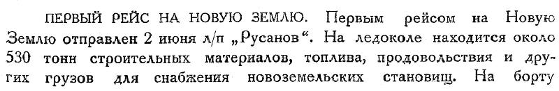 ПЕРВЫЙ РЕЙС НА НОВУЮ ЗЕМЛЮ. Первым рейсом на Новую Землю отправлен 2 июня л/п „Русанов". На ледоколе находится около 530 тонн строительных материалов, топлива, продовольствия и других грузов для снабжения новоземельских становищ. На борту „Русанова" находится нефтеизыскательская партия Арктического института, которая будет вести разведывательные работы в районах, прилегающих к губе Нехватовой и к проливу Междушарскому.