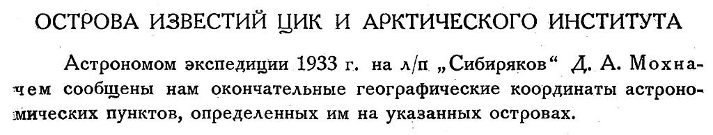 Астрономом экспедиции 1933 г. на л/п. „Сибиряков“ Д. А. Мохначем* сообщены нам окончательные географические координаты астрономических пунктов, определенных им на указанных островах.