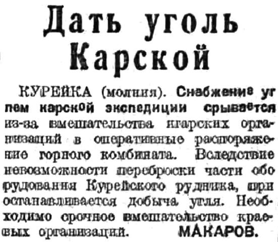 КУРЕЙКА (молния). Снабжение углем карской экспедиции срывается из-за вмешательства игарских организаций в оперативные распоряжения горного комбината. Вследствие невозможности пероброски части оборудования Курейского рудника, приостанавливается добыча угля. Необходимо срочное вмешательство краевых организаций.