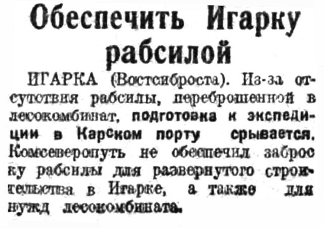 ИГАРКА (Востсиброста). Из-за отсутствия рабсилы, переброшенной в лесокомбинат, подготовка к экспедиции в Карском порту срывается. Комсеверопуть не обеспечил заброску рабсилы для развернутого строительства в Игарке, а также для нужд лесокомбината.
