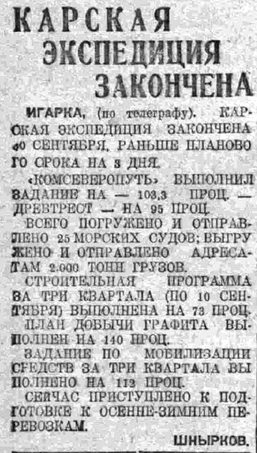 Закончившаяся вчера карская операция превратила морской путь к Енисею и Оби с запада в обычную транспортную артерию. Об этой победе, завоеванной в течение 12 лет работы Комсеверопути, экспедиционный и летный состав Комсеверопути, комсостав и команда ледокола вчера рапортовали по телеграфу ЦК партии — тов. Сталину, Совнаркому — тов. Молотову, Реввоенсовету — тов. Каменеву. В своей телеграмме участники экспедиции пишут: